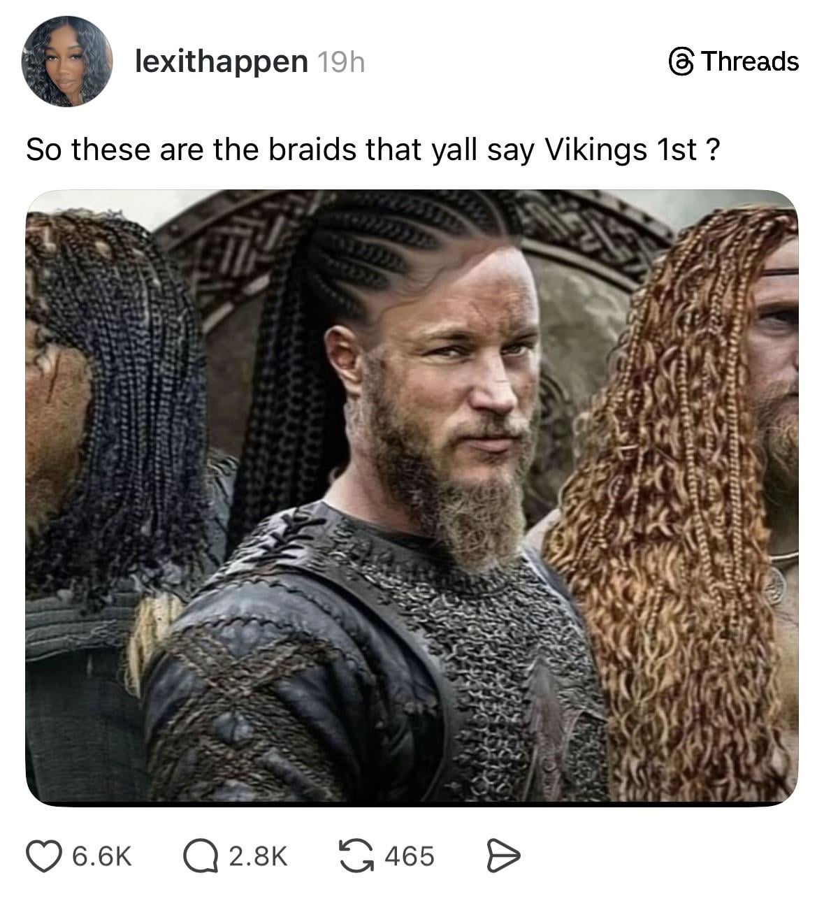 I’ve seen some pictures of vikings, their braids weren’t even like that. Nowadays viking TV/movies just give them these afro braids and folks start claiming ‘Oh many cultures had braids’ – like come on we know you had something, just not these.Â
