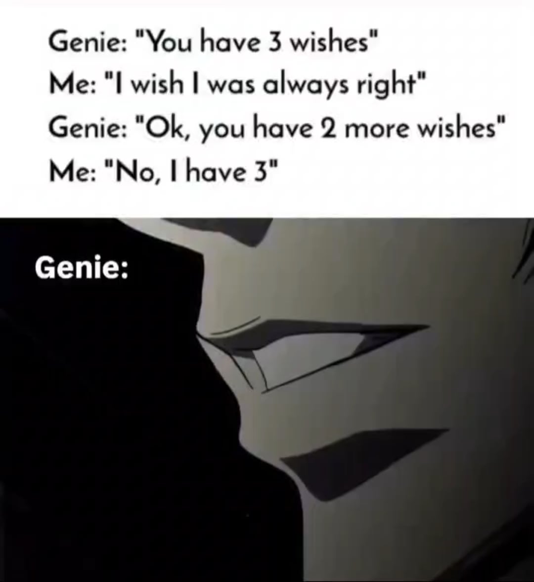 MithonOsborne on January 2, 2026 2:54 pm I feel like you’d have to say “I wish whatever I said became true”. If you wish whatever you said was right, i feel like thatd just force you to say the right things