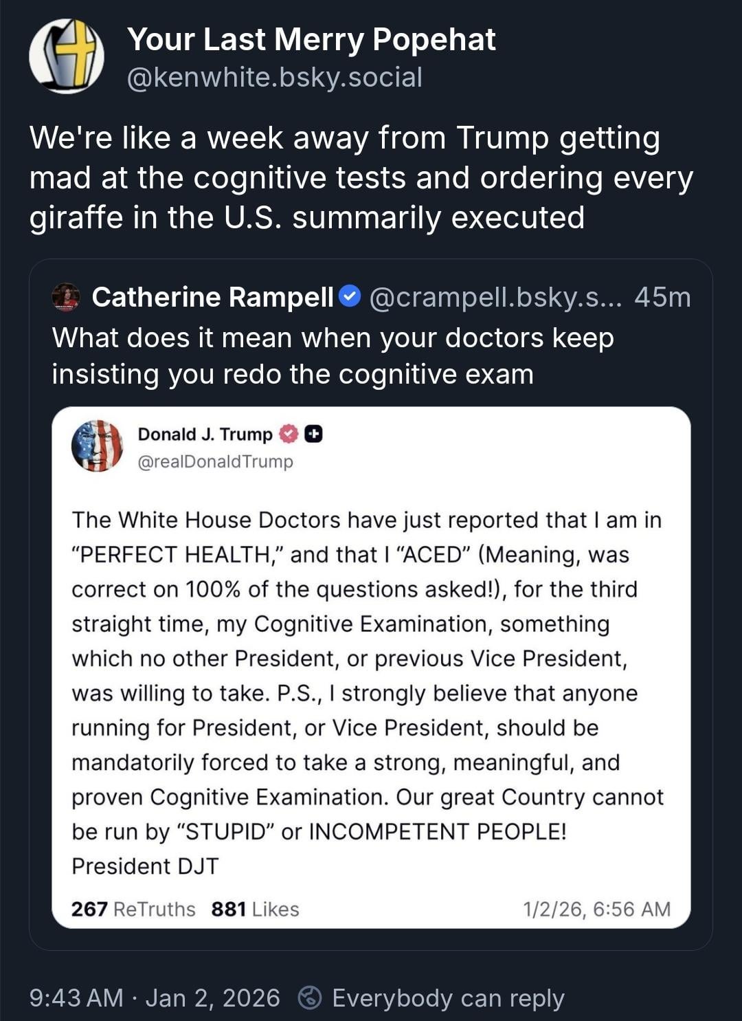 It’s amusing that he doesn’t question why he’s getting so many cognitive tests while other Presidents didn’t need them.