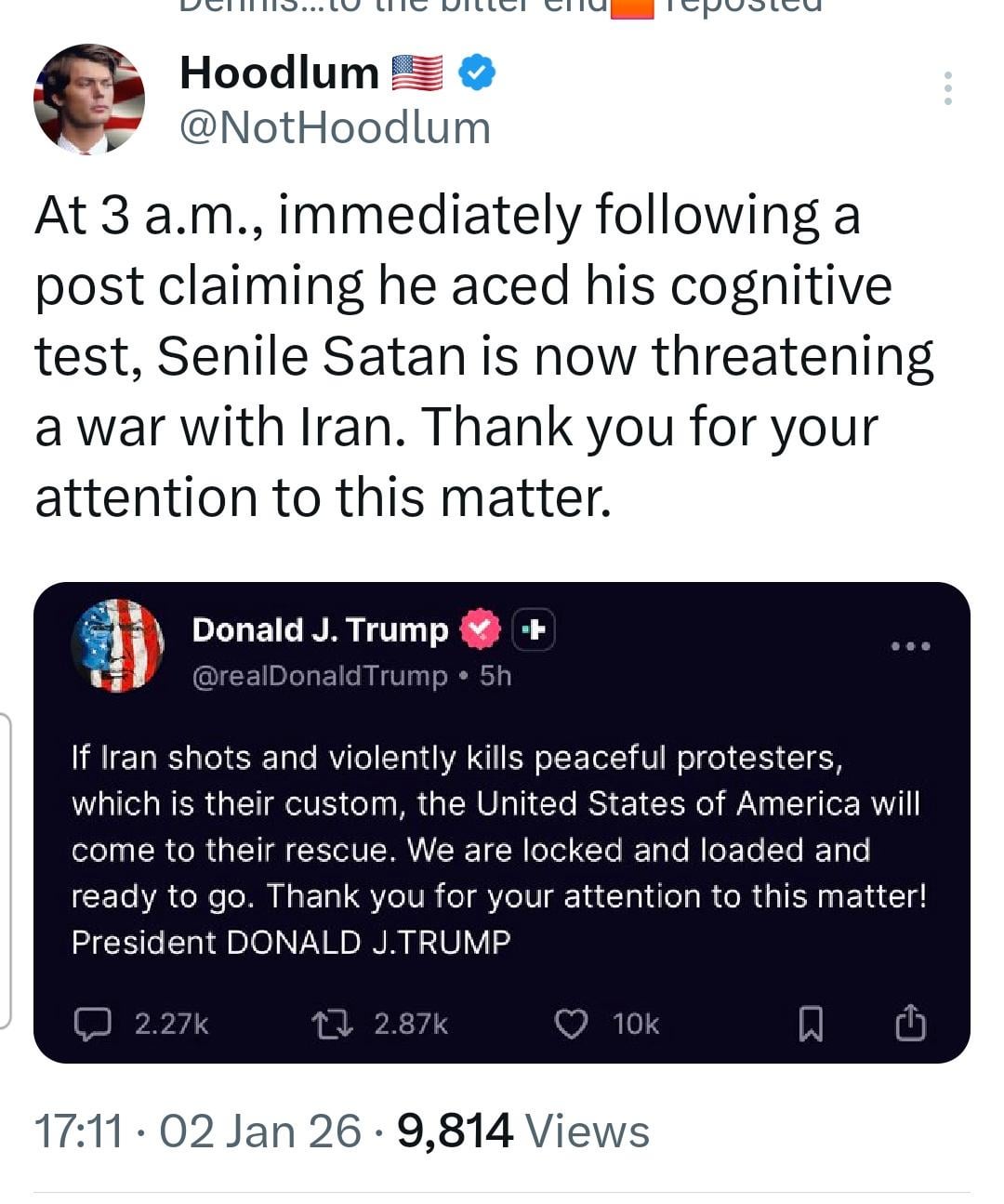 I can’t tell if he means he will come to the aid of the protestors or Iran