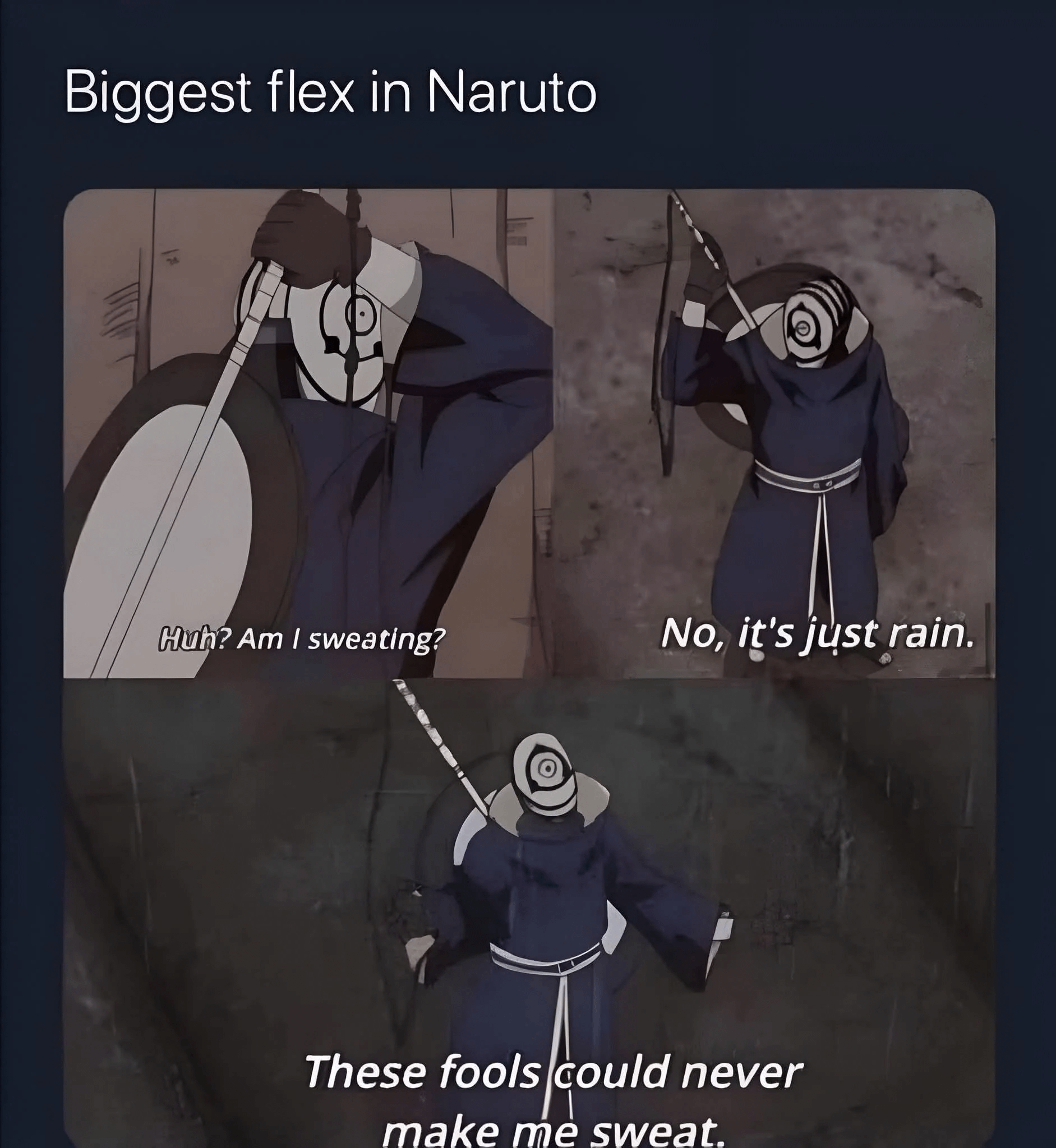 While Obito was actually sweating a bit here it’s still a freaking cool line to deliver by chunchunmaru1129