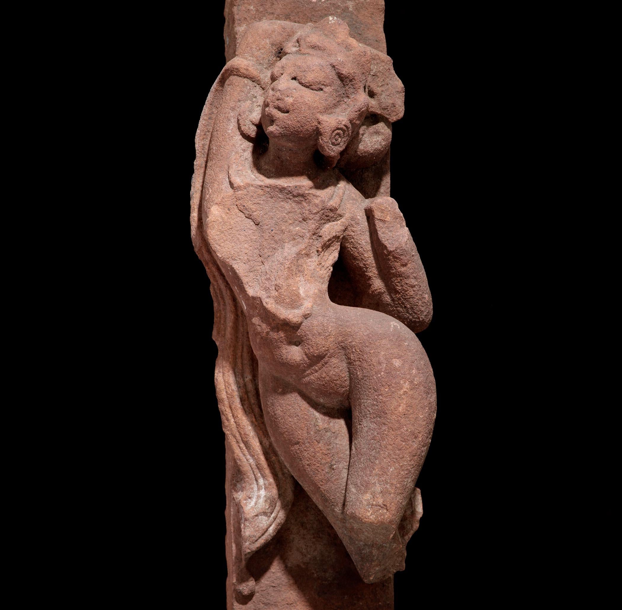[Museum](https://rietberg.ch/en/collections/rvi-108). This sensual sculpture likely once adorned the exterior wall of a Hindu temple in western India. Women, nymphs, and even explicitly erotic motifs were part of the repertoire of Hindu temple architecture and design. The woman stands in the typical, almost exaggerated Tribhanga pose, resembling an S-curve, which corresponds to contrapposto in Western art. This graceful pose is very popular in Indian performing and visual arts.