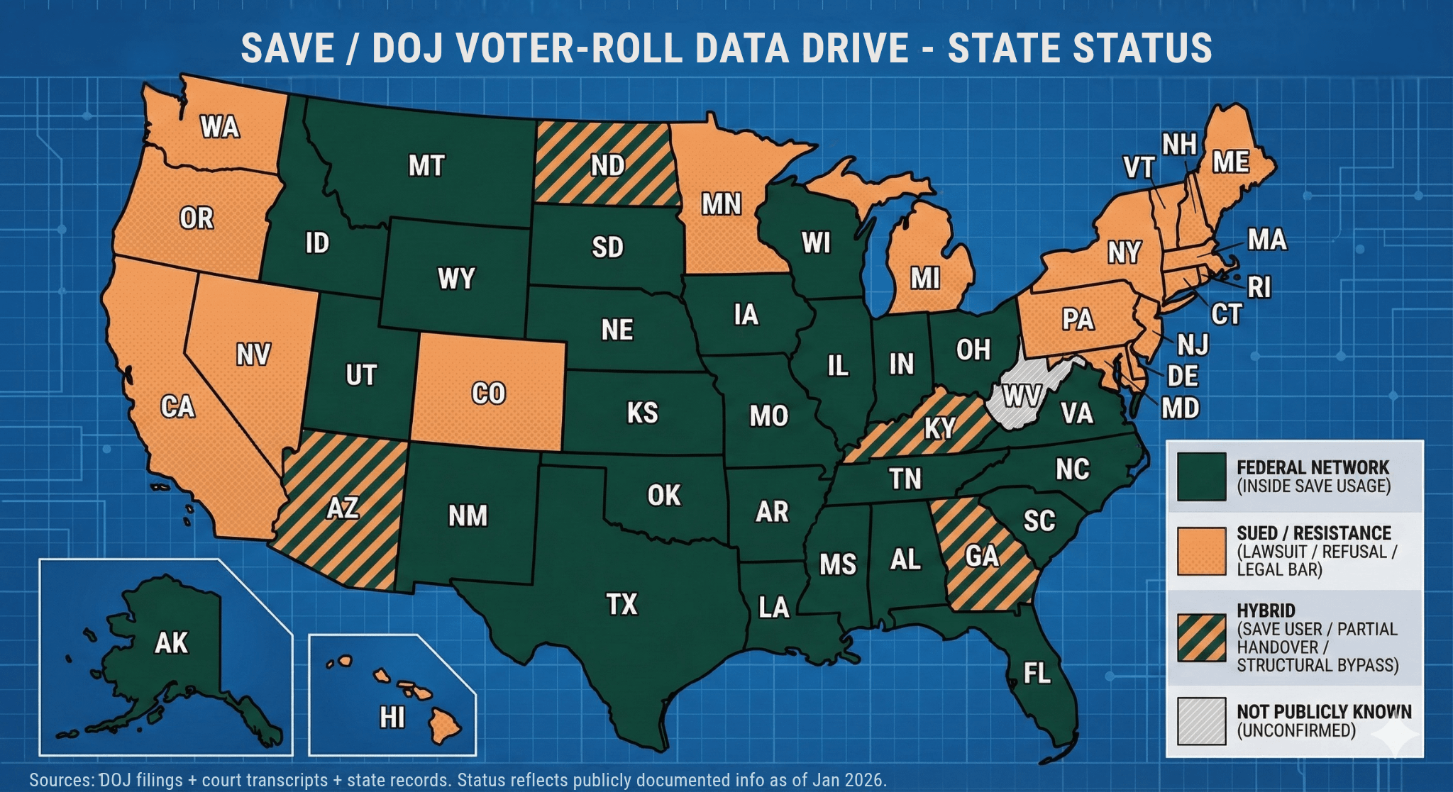 Methodology: States were classified based on documented participation, litigation, or formal refusals regarding DOJ SAVE voter-verification workflows.