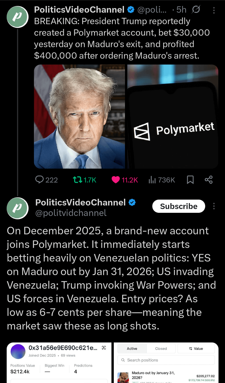 10. On the last trading day before the attack, there was a massive divergence between energy / defense stocks and the broader market. While the S&P 500 was essentially flat (+0.19%), the “Absolute Resolve” sectors saw aggressive institutional loading. All gearing up for some weekend events. I gotta pay more attention next time and get in on this come-up.