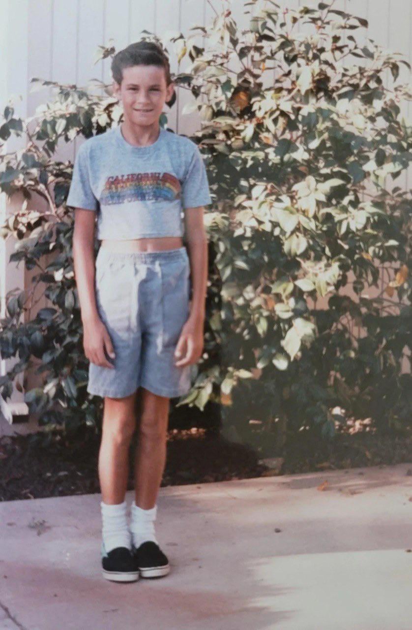 Peak 80s kid uniform: High-waisted shorts, tube socks pulled up, and that fresh haircut. Iconic