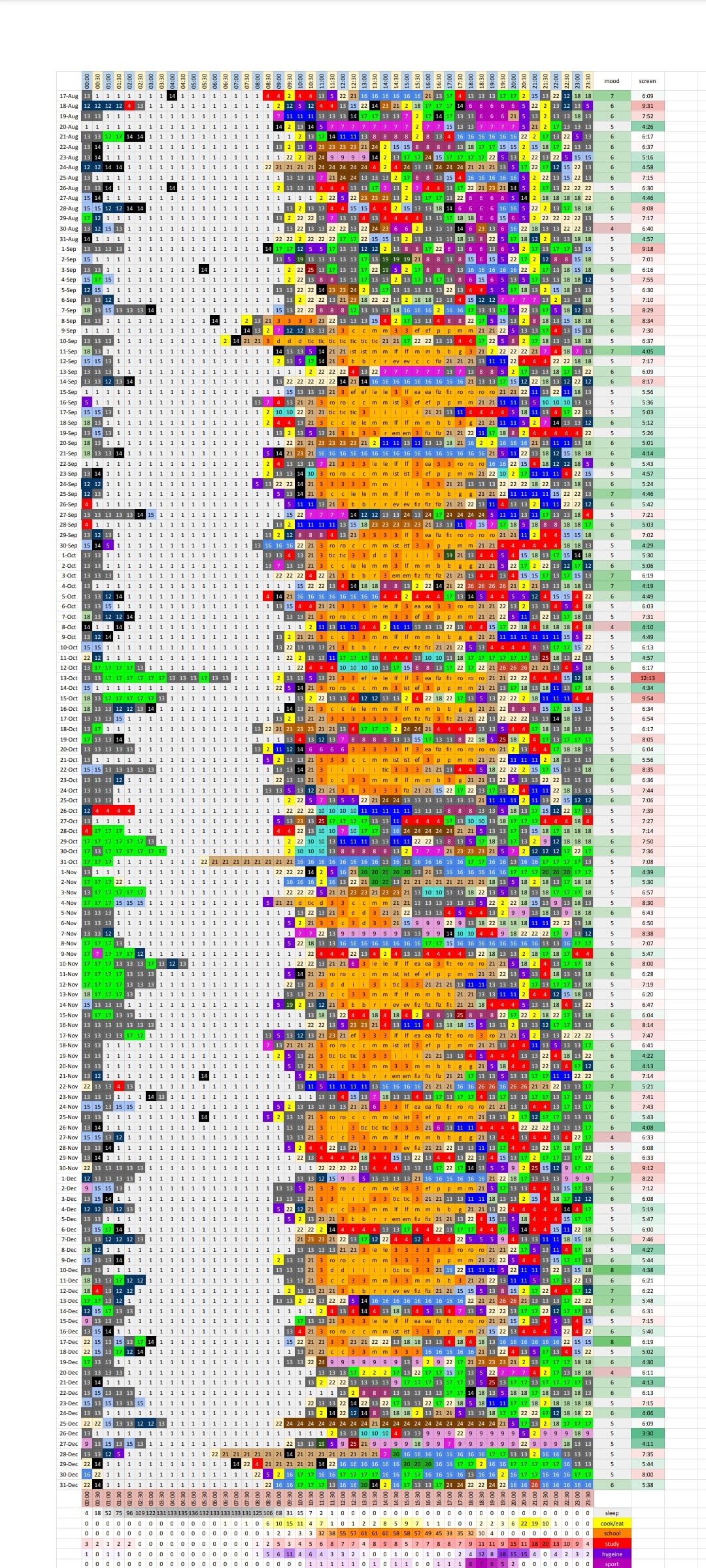 I started tracking what I did every 30 minutes back in August and finished the spreasheet a few days ago. The codes for every color and a pie chart with all the activities are on the 2nd slide. I also tracked how good each day was on a 0 to 10 scale (5 being neutral) and my screen time.