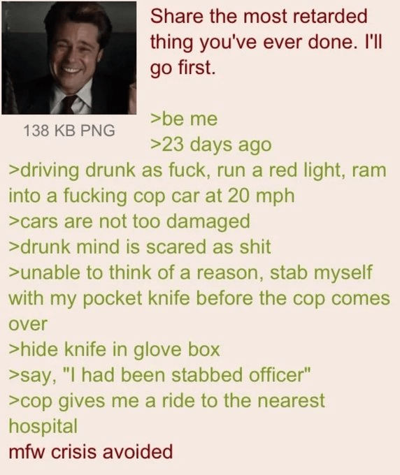 I know this is likely made up, but even drunk, I don’t know if I’d be able to stab myself…. that really hurts and you can really do some major damage of you hit the wrong area