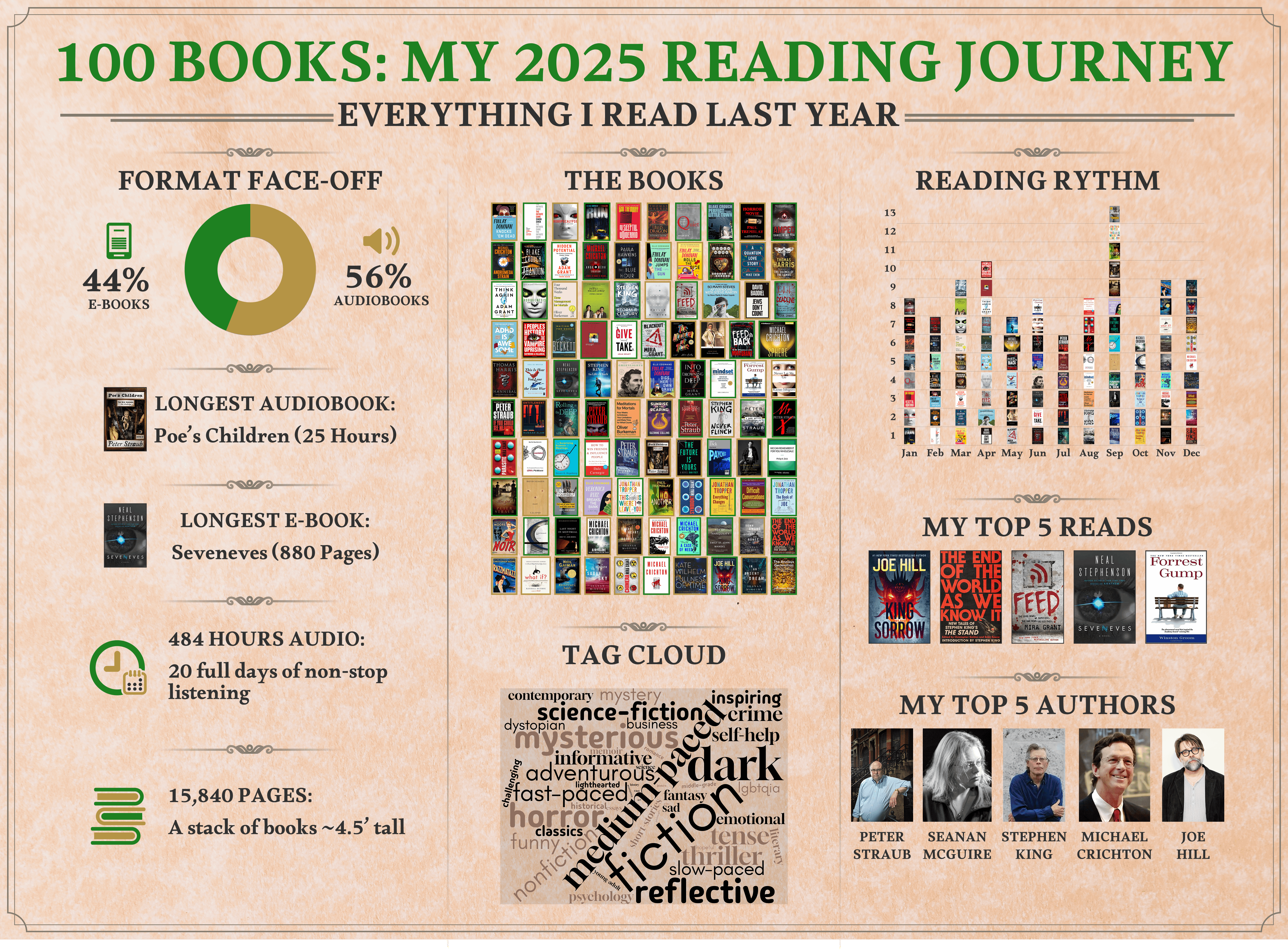 I used goodreads.com and https://app.thestorygraph.com/ to track my reading habits over 2025. I finished my 100th book at 10:30 on New Years Eve! I used Google Sheets to calculate the numbers and Figma for the visualizations by Jasonmcmains