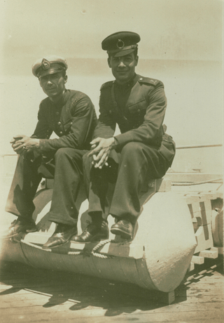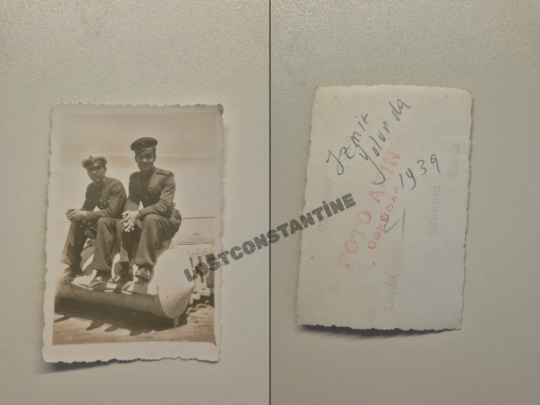 A rare 1939 snapshot from my collection showing a Turkish sailor and soldier sharing a journey. The back features a handwritten ‘İzmit yolunda 1939’ (On the road to Izmit) note and a historic ‘FOTO AKIN – ÜSKÜDAR’ studio stamp.