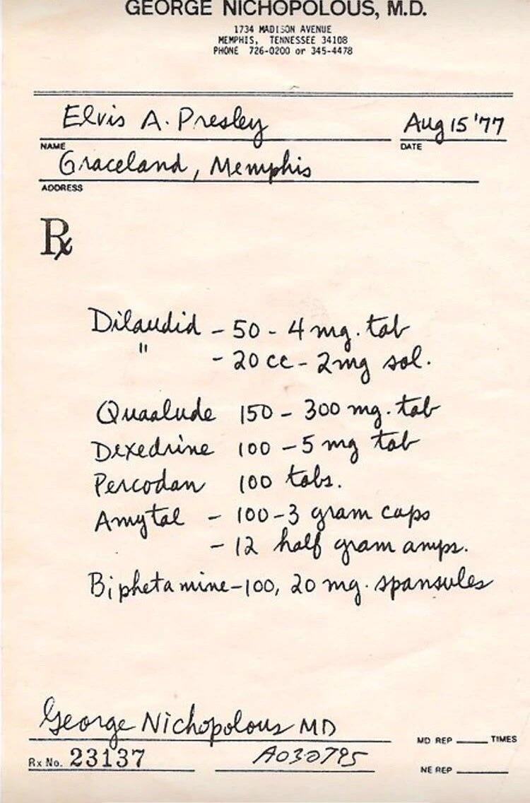 “In the first eight months of 1977 alone, Nichopoulos had prescribed over 10,000 doses[7] of amphetamines, barbiturates, narcotics, tranquilizers, sleeping pills, laxatives, and hormones for Presley.”