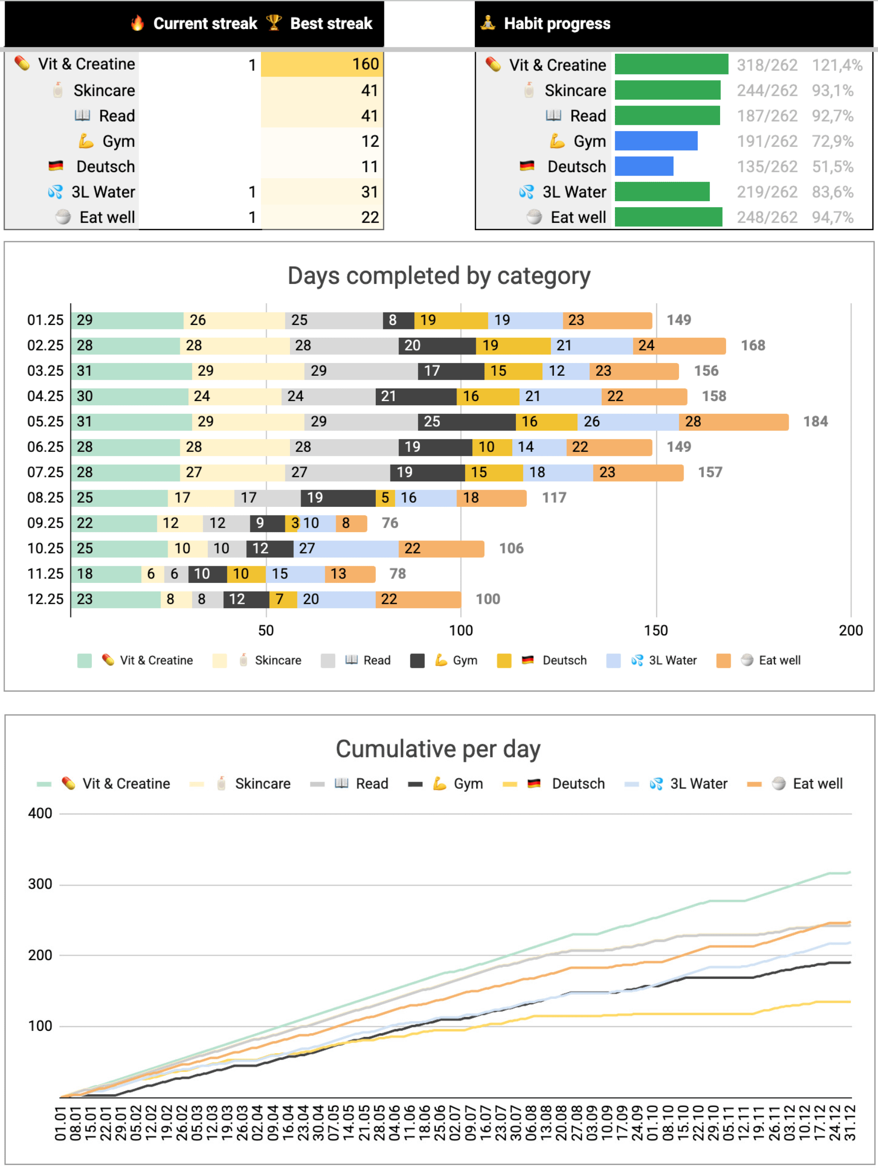 [A year ago I shared my daily habit tracker spreadsheet](https://old.reddit.com/r/dataisbeautiful/comments/1hkzsjm/how_i_tracked_my_habits_in_2024_a_simple/), and here’s how 2025 went for me.
