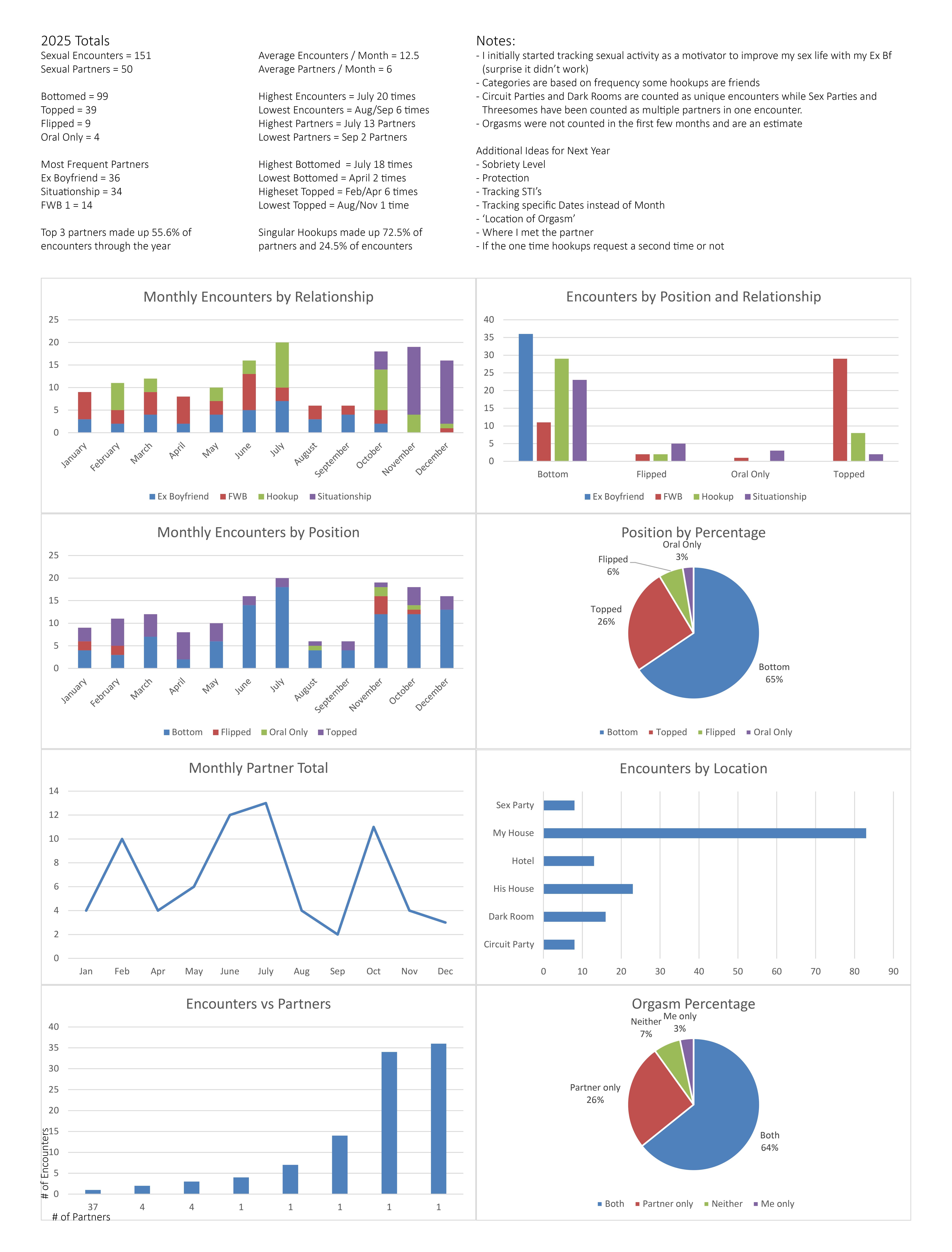 Depending on where you live, the public health training in me suggests you track things like condom use (if any) and medication adherence (examples: PrEP, doxyPEP, HIV meds if living with HIV). If you’re seeking to best understand satisfaction along with, or versus, sexual health considerations, that could be a nice eye opener for you (even if you don’t share publicly).