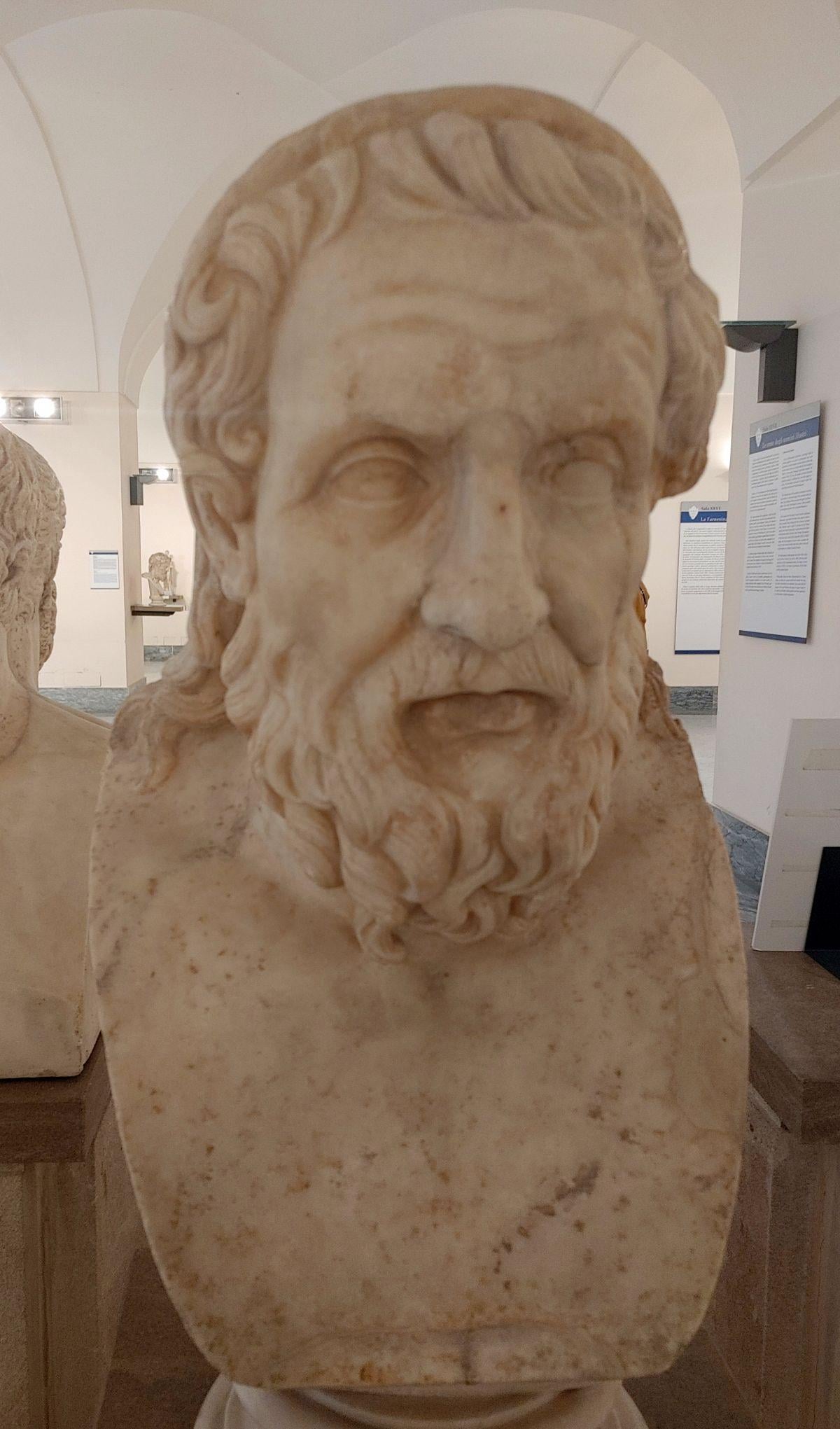 Roman sculpture depicting Homer. The object is a Roman copy, from the reign of Emperor Hadrian (117-138 CE), of a Greek original from the 4th century BCE. The artifact is located in the National Archaeological Museum of Naples. [1200×2041]