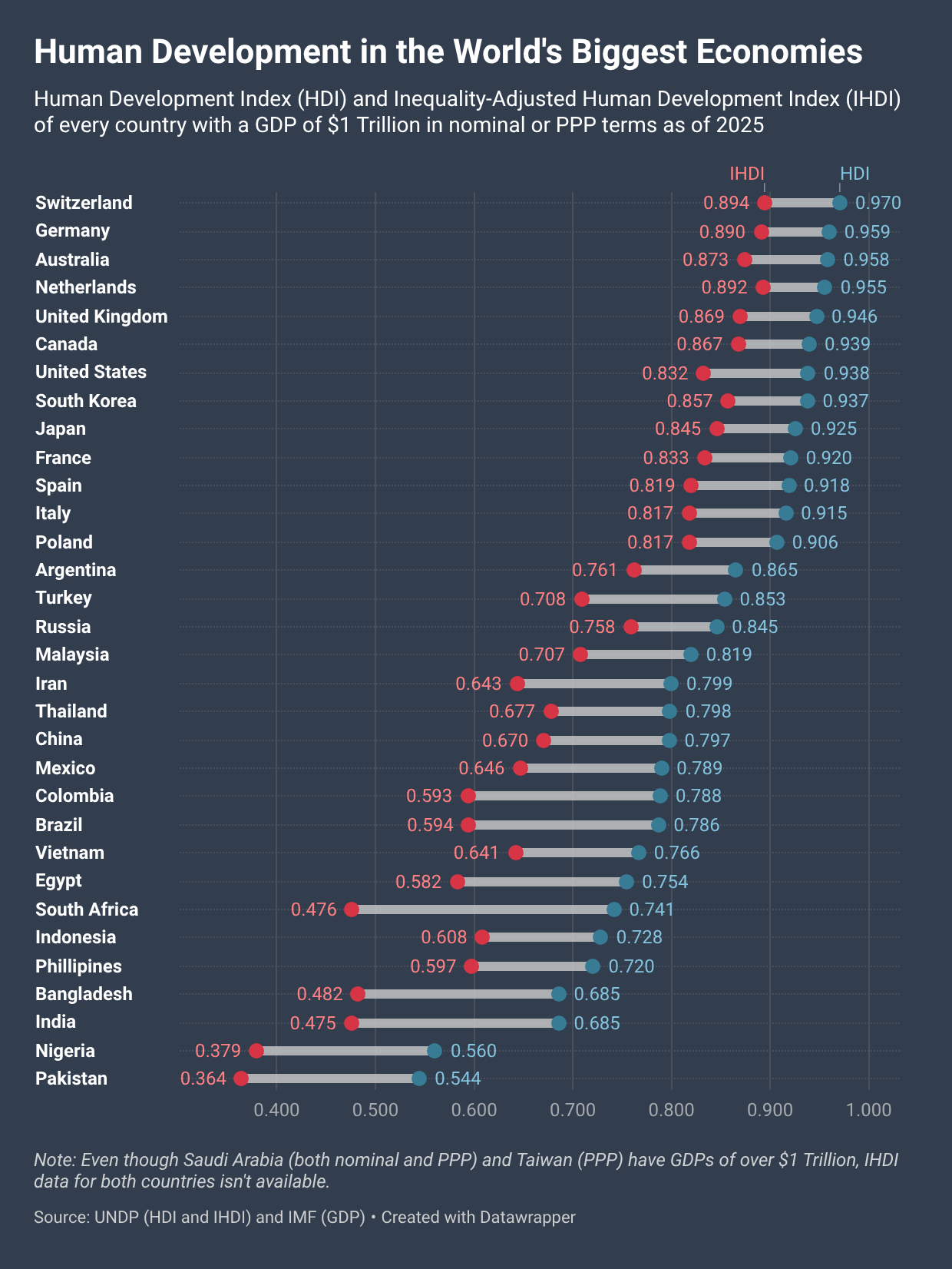 Source: [IMF ](https://data.imf.org/en/Data-Explorer?datasetUrn=IMF.RES:WEO(9.0.0)) for GDP and [UNDP Human Development report ](https://hdr.undp.org/system/files/documents/global-report-document/hdr2025reporten.pdf) for HDI and IHDI