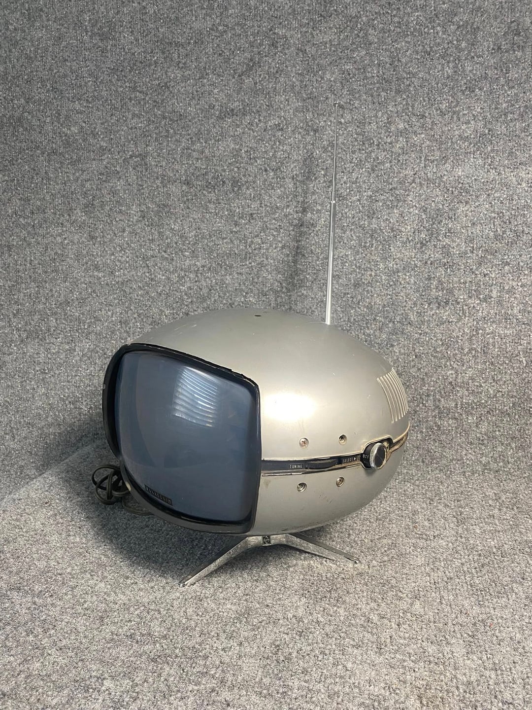 Panasonic TR-005 Orbitel (also known as the "Flying Saucer" or "The Eyeball" due to its shape) was a television set that was manufactured from the late 1960s to early 1970s by Panasonic. It had a five-inch screen, earphone jack, and could rotate 180 degrees on its chrome tripod.