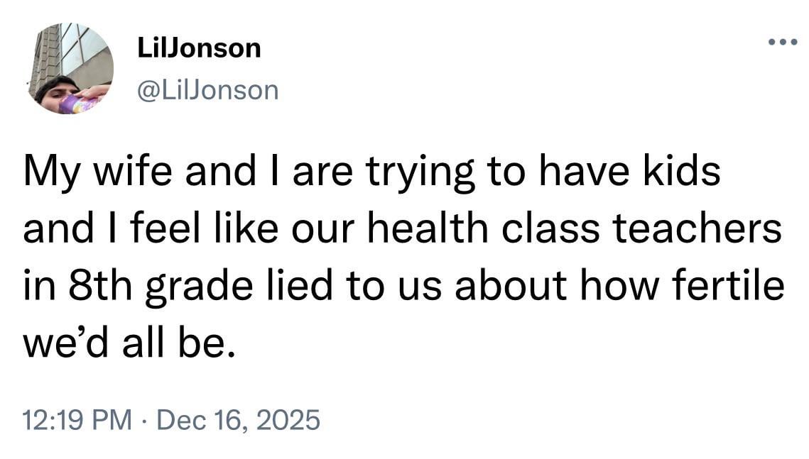 Well, when you’re in 8th grade, a non-zero chance of getting pregnant is way too high. When you’re an adult and trying to get pregnant, the actual percentage chance of getting pregnant seems too low.