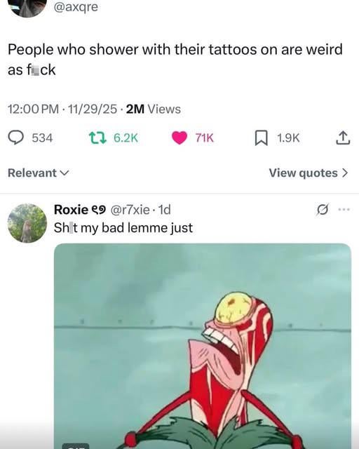 Technical_Instance_2 on January 6, 2026 3:59 pm How tf would you even take off a tattoo without ripping it off or removing it via laser before every shower?