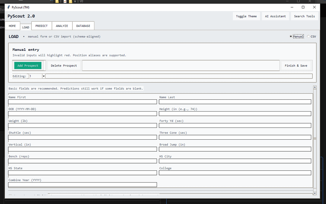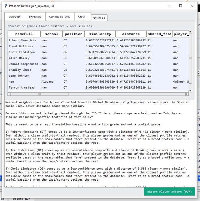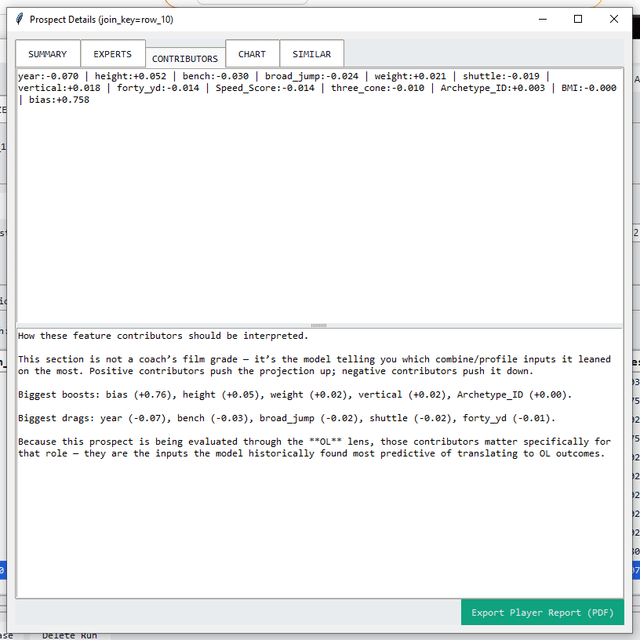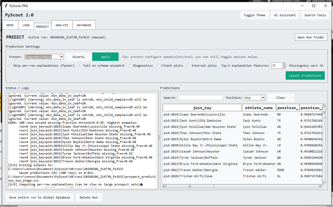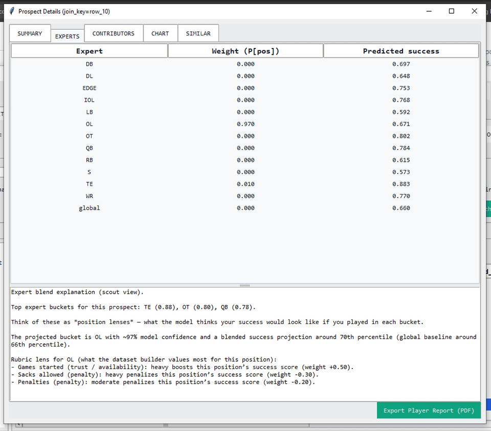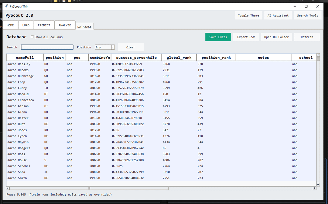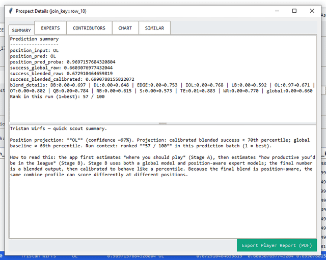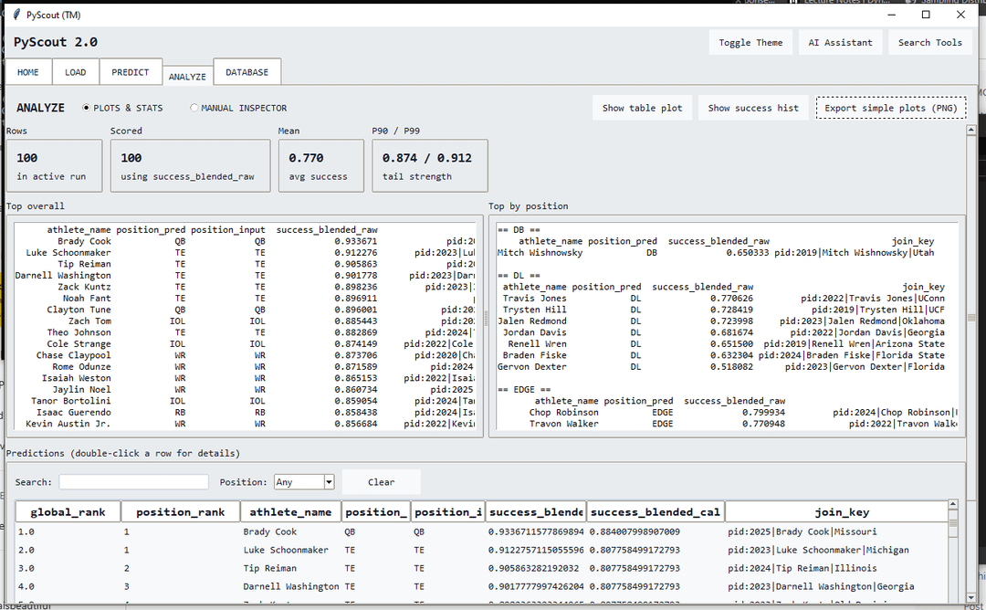 For the professional scouts and coaches out there, the release of PyScout 2.0 is here to up your scouting game. Trained on Todd Steussie's legendary dataset of NFL stats from 2004-2019 + open-source nflverse data from 2019-2025, PyScout 2.0 is a machine-learning software designed to predict the position+success percentile/rank of a list of prospects+their athletic profiles+drill data.
