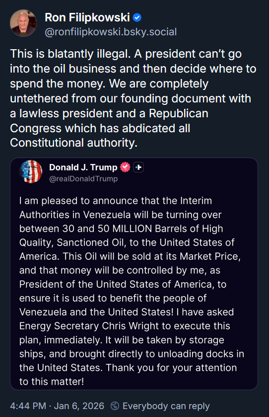 And by announcing he will be in control of the oil proceeds, all accountability has been abandoned. As always, he’ll report a generalized benefit to Americans, berate anyone who requests evidence, and embezzle it how he wishes.