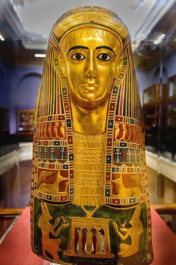 Over the head spread the wings of a vulture while a winged sun disc, symbol of rebirth in the afterlife is on its forehead. Mummy masks of the Ptolemaic and Roman periods often had gilded faces that reflected the association of the deceased with the gods. This mask has been molded over a core, with layers of mud and linen. They were used to protect and idealize the facial features of the deceased. Roman Period, ca. 30 BC-395 CE. Gilded and painted cartonnage. [600 x 900