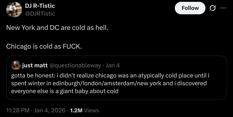Bruh. I work in Chicago often now and bruh, Chicago cold was fucking up my NYC ass lmfao. I had the full kit on, North Face, skully, Timbs and the long John’s and I was still shivering like a mf smh. Not looking forward to next week lmfao