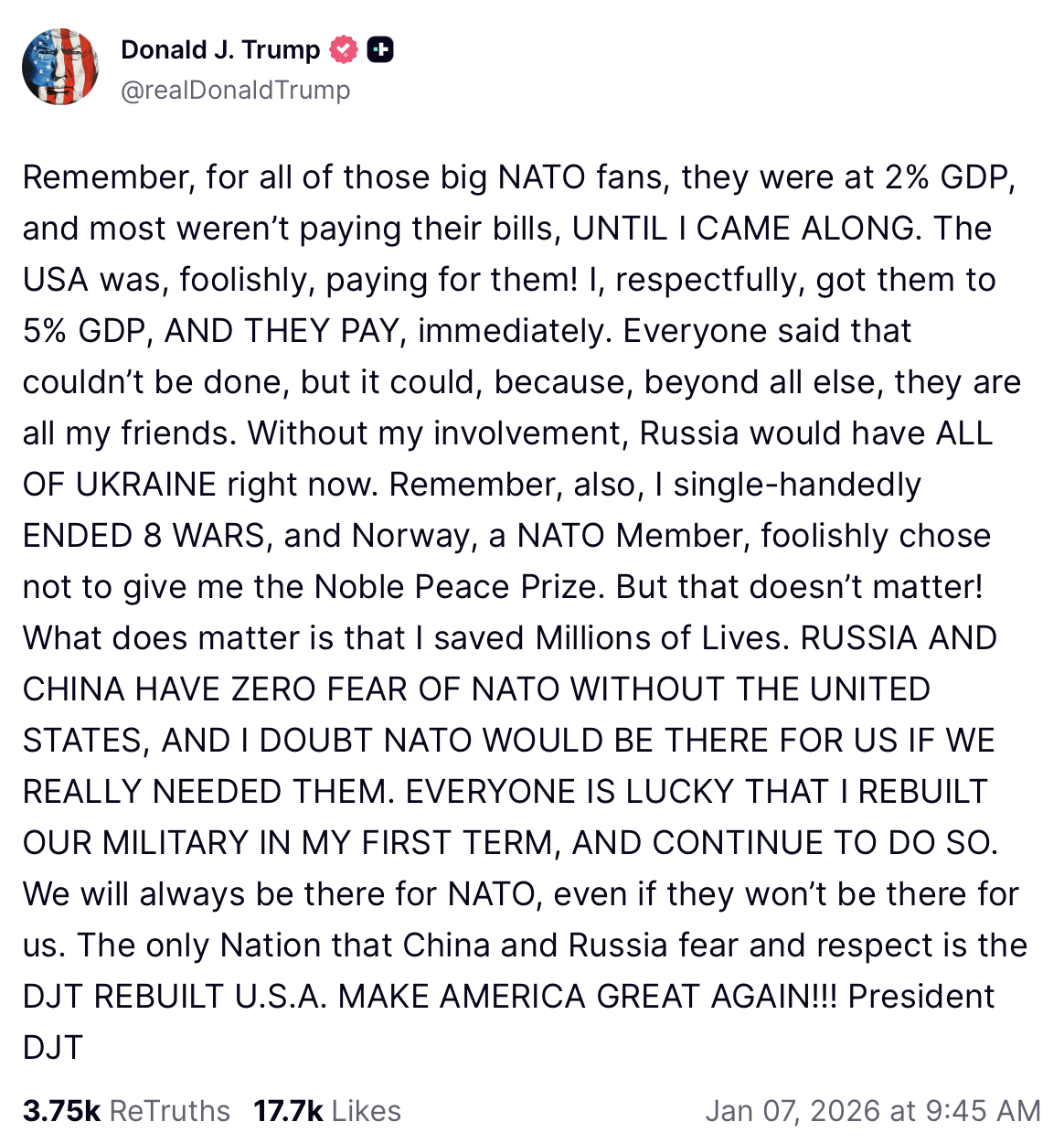 >We will always be there for NATO, even if they won’t be there for us.
