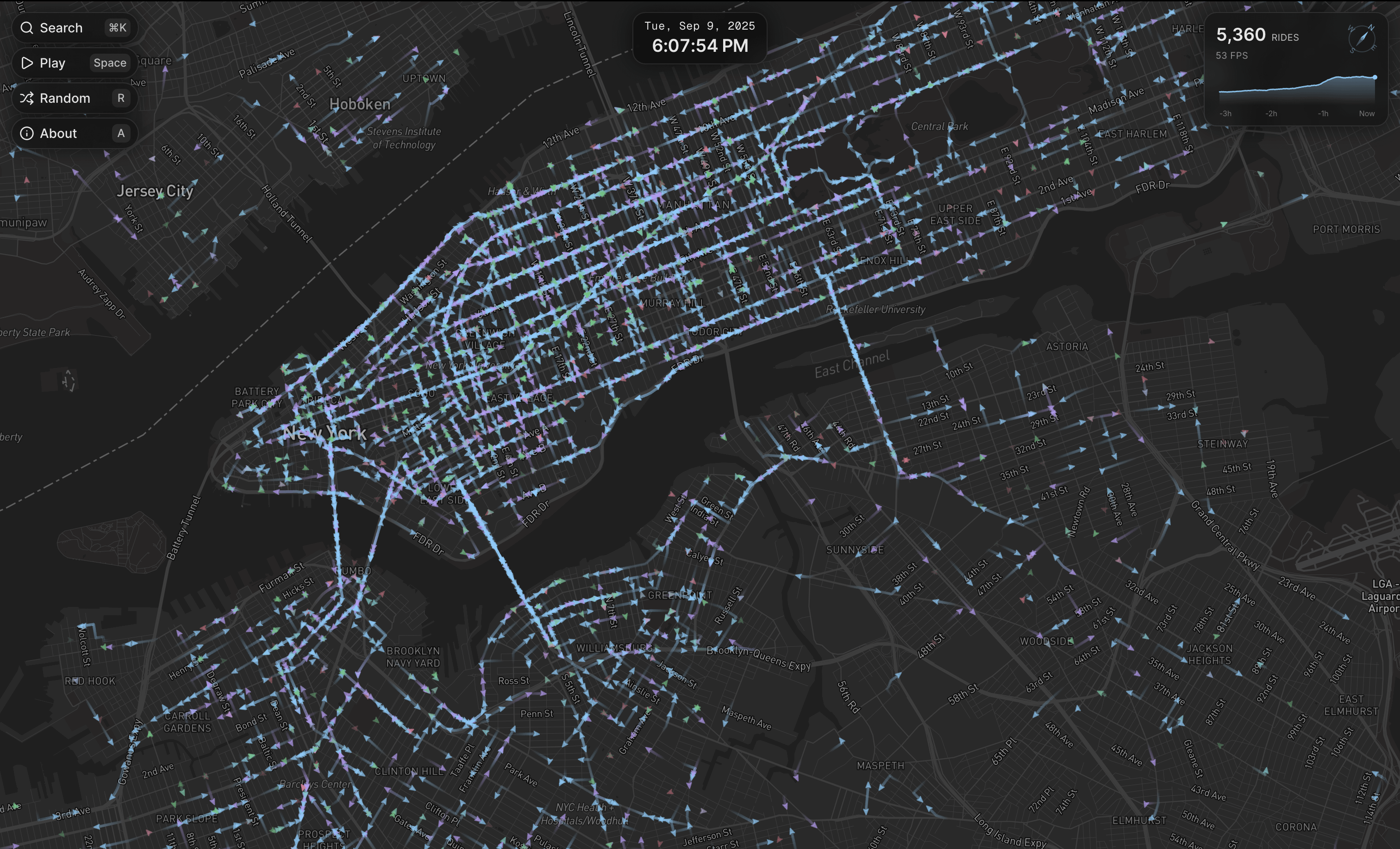 1. I’m using Mapbox + [deck.gl](http://deck.gl) for the visualization, and all my processed data is stored in parquet files on a CDN, which DuckDB WASM queries directly using SQL from the browser.