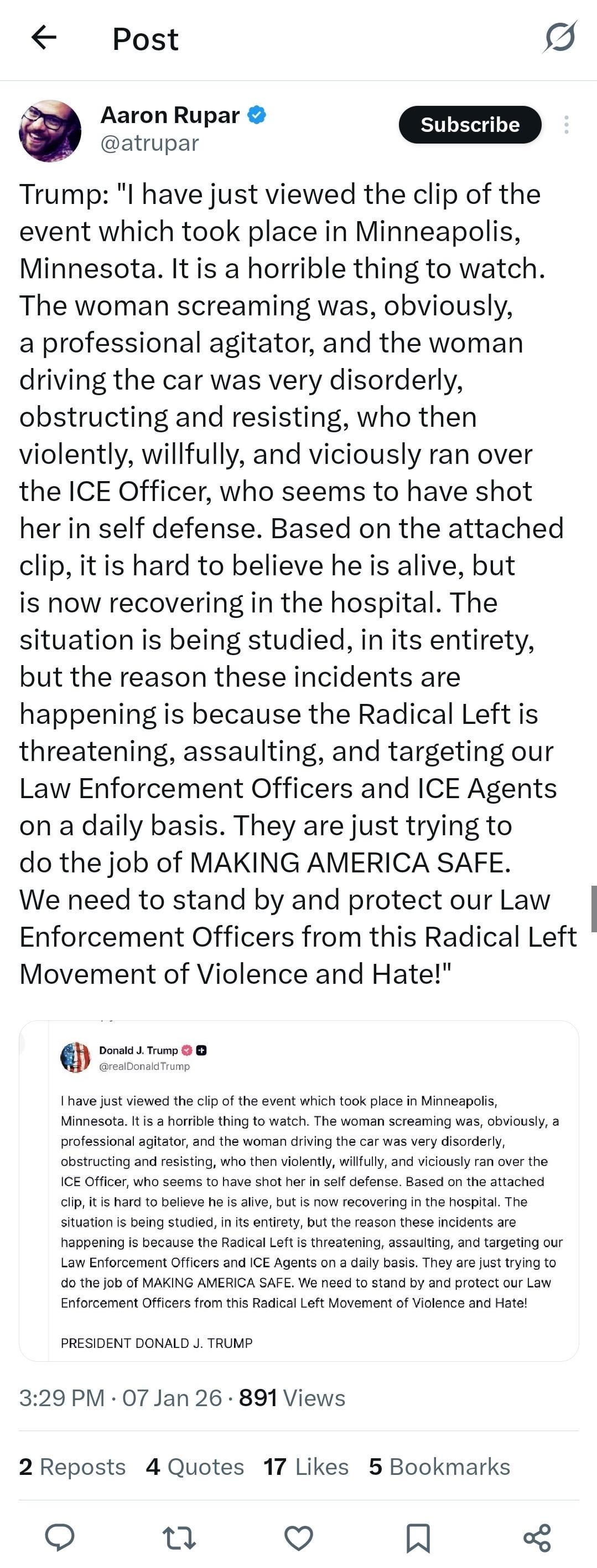 Edit: downvote me you fucking fascist bots. This president is posting doctored material to justify his IMMIGRATION agents killing someone in MINNESOTA