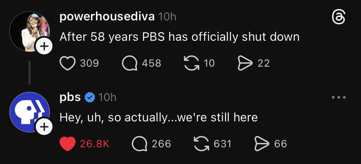 I think they’ve confused PBS with the Corporation for Public Broadcasting, which was funded by taxpayer dollars. *That* part is shutting down.