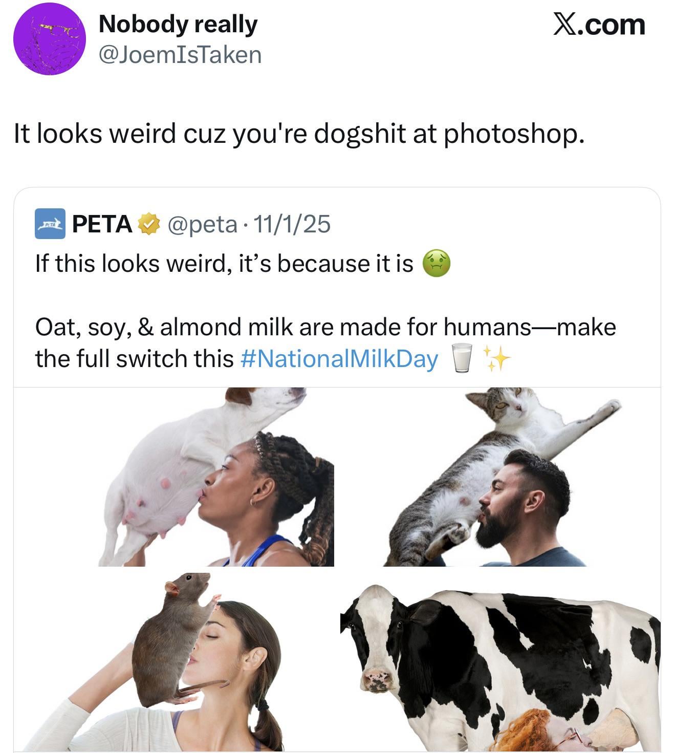 Wish the furries would spam their renditions to that post. Show PETA what true degeneracy looks like.