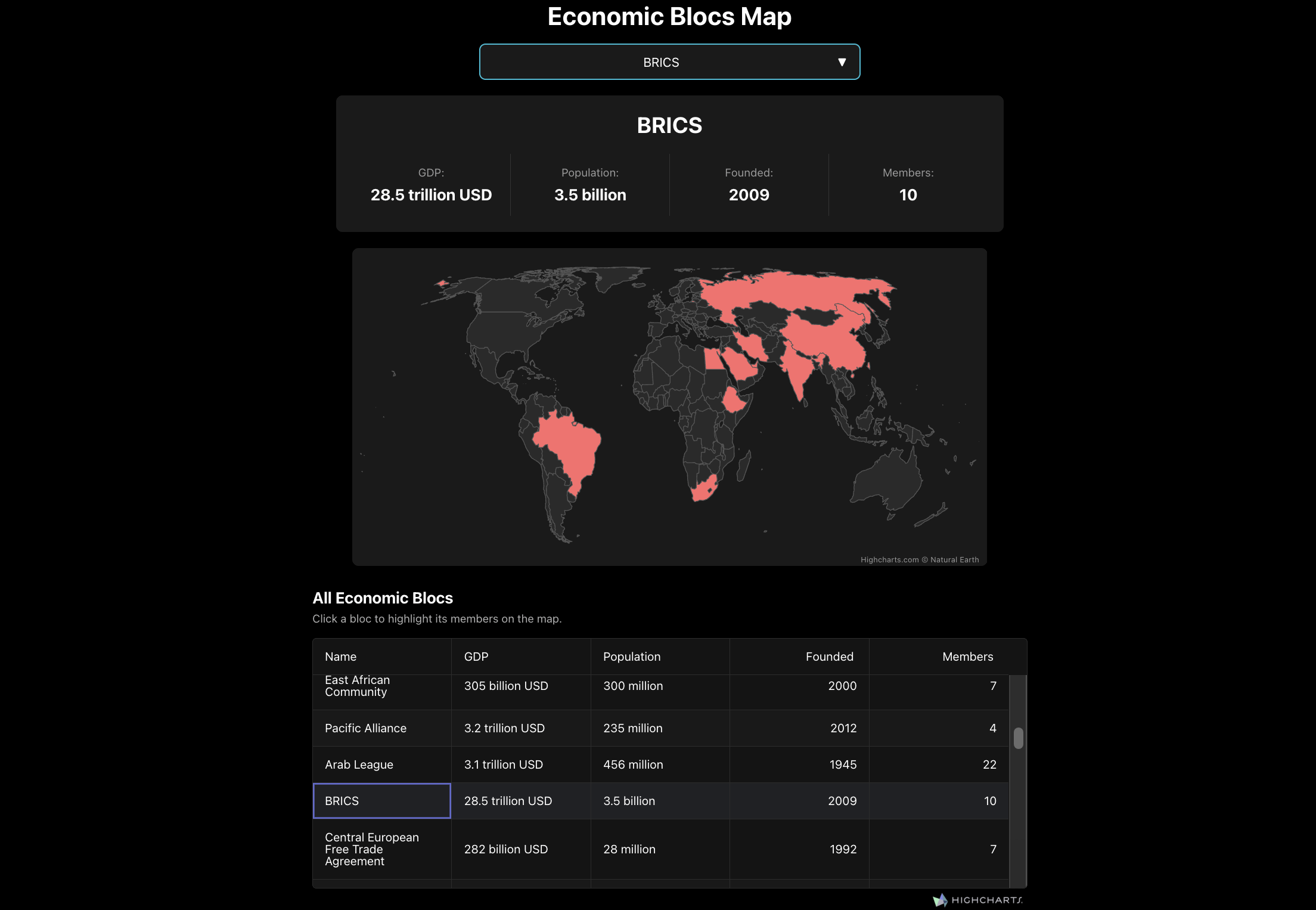 I used reactsJs and highcharts. The entire project and code in ReactJS here https://www.highcharts.com/blog/tutorials/building-an-economic-blocs-map-with-highcharts-react-and-grid/