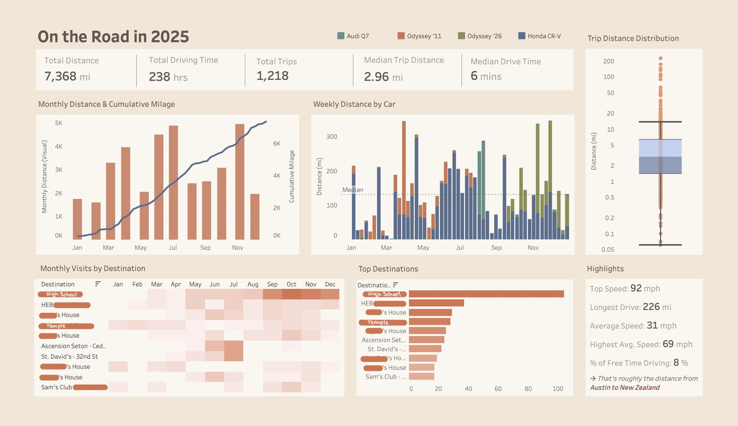 Hi! I made a visualization of every drive I did last year in Tableau. It was my first time using the software so it took a while but any suggestions?