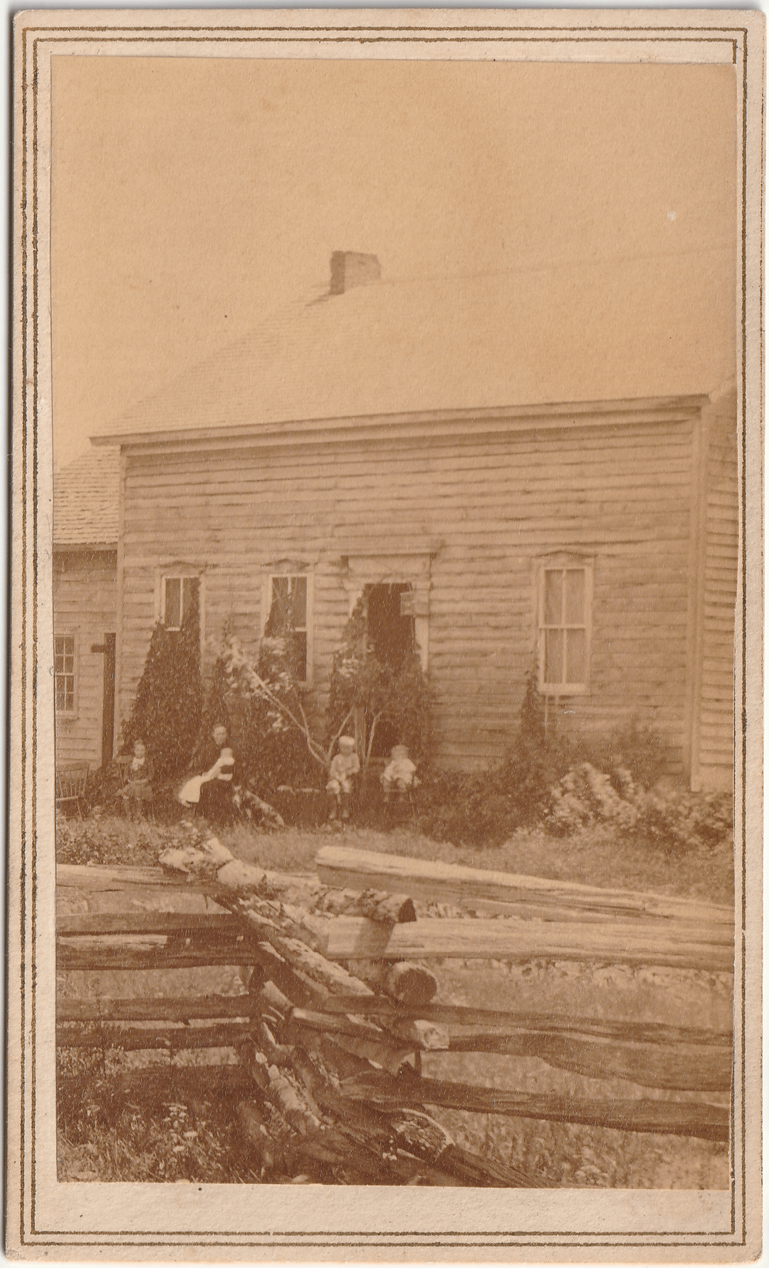 The first image shows a woman holding a baby, with a dog at her side, surrounded by three children seated in chairs outside a farmhouse. A split rail fence is visible in the foreground. This CDV has a two-cent blue U.S. Internal Revenue Bank Check stamp affixed to the back, bearing a cancellation date of 16 Aug. 1864.