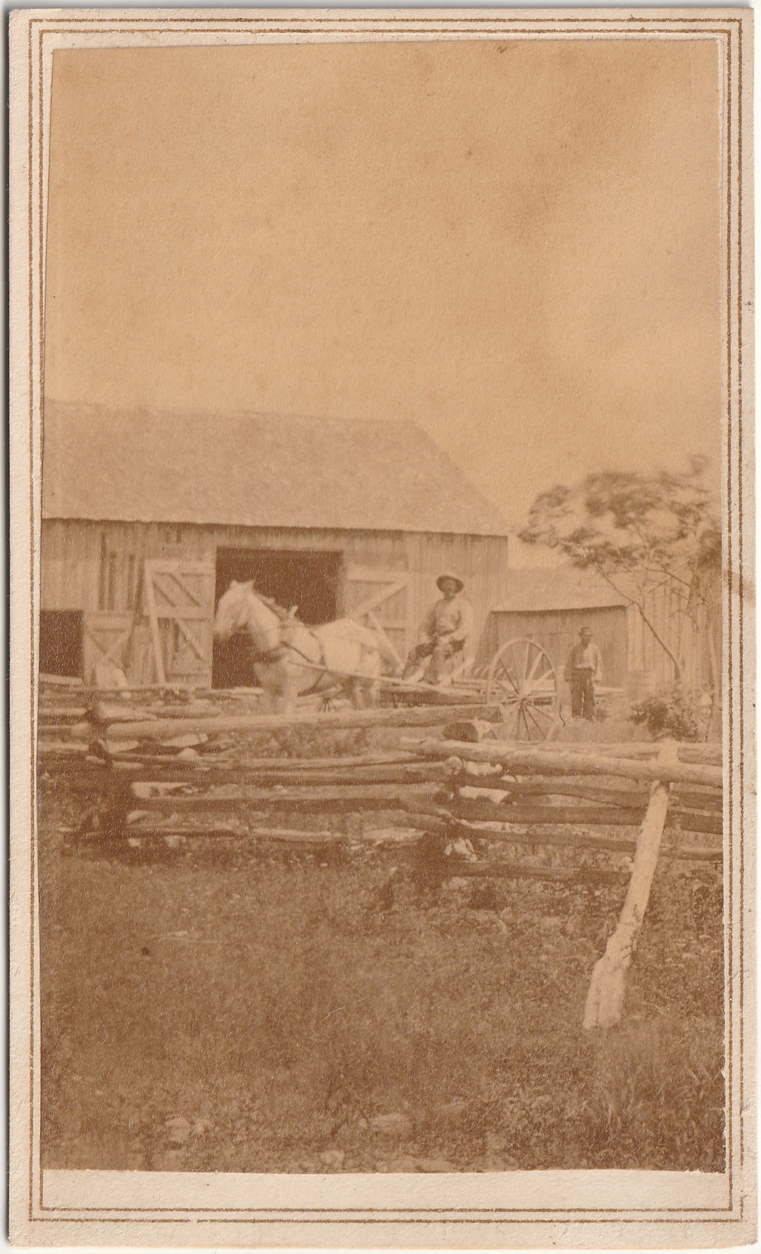 The third image shows two men outside a barn, perhaps taken on the opposite side of the barn in the second image or a different location on the same property. One man sits atop a horse-drawn cultivator, reins in hand, with the other standing behind it. A split rail fence is visible in the foreground.