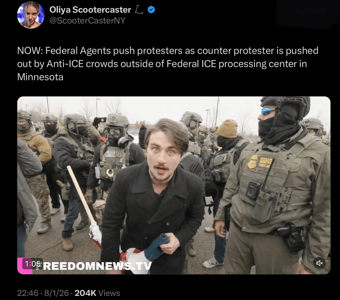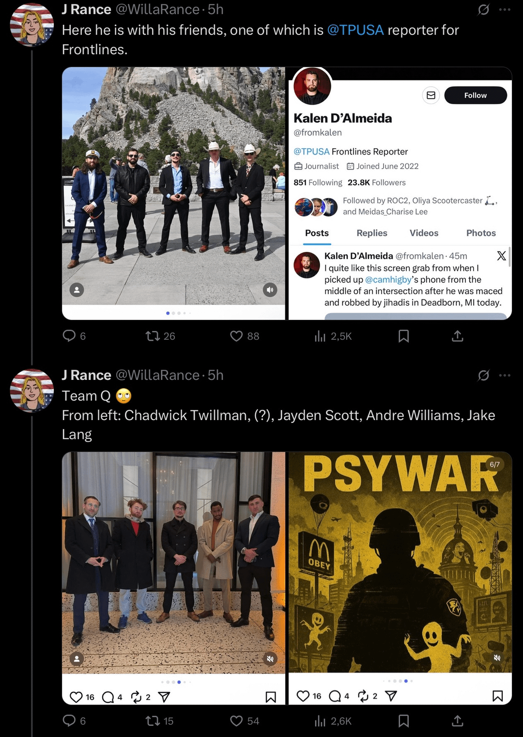 The QAnon Agitator who was recorded shouting “We executed one of you yesterday” is Jayden Scott, who is friends with Turning Point USA Frontlines Reporter Kalen D’Almeida, and pictured with MAGA Influencers Andrew Williams, Jan 6 Rioter Jake Lang, and Michigan Senate Candidate Chadwick Twillman.