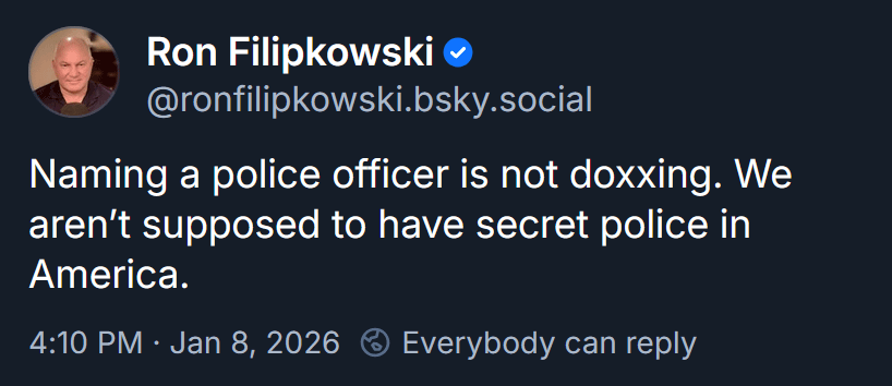Faces and badges should be publicly available and visible, and body cams should be FOIA requestable. Fascist don’t want this, and Americans should all be anti fucking fascist
