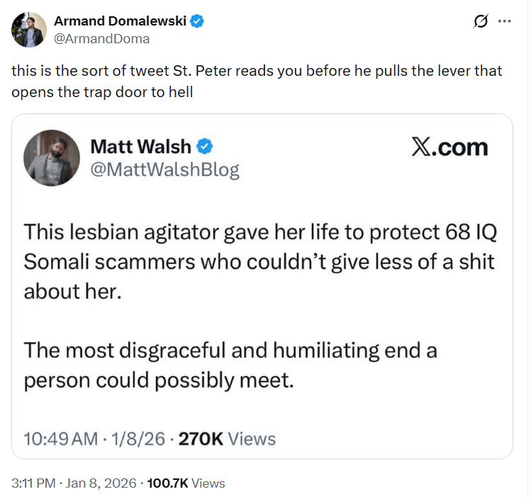 Matt Walsh (who is himself a closeted homosexual) makes sure to remind his rabid minions of her sexuality so they remember it’s okay to celebrate the murder of a white female/mother.