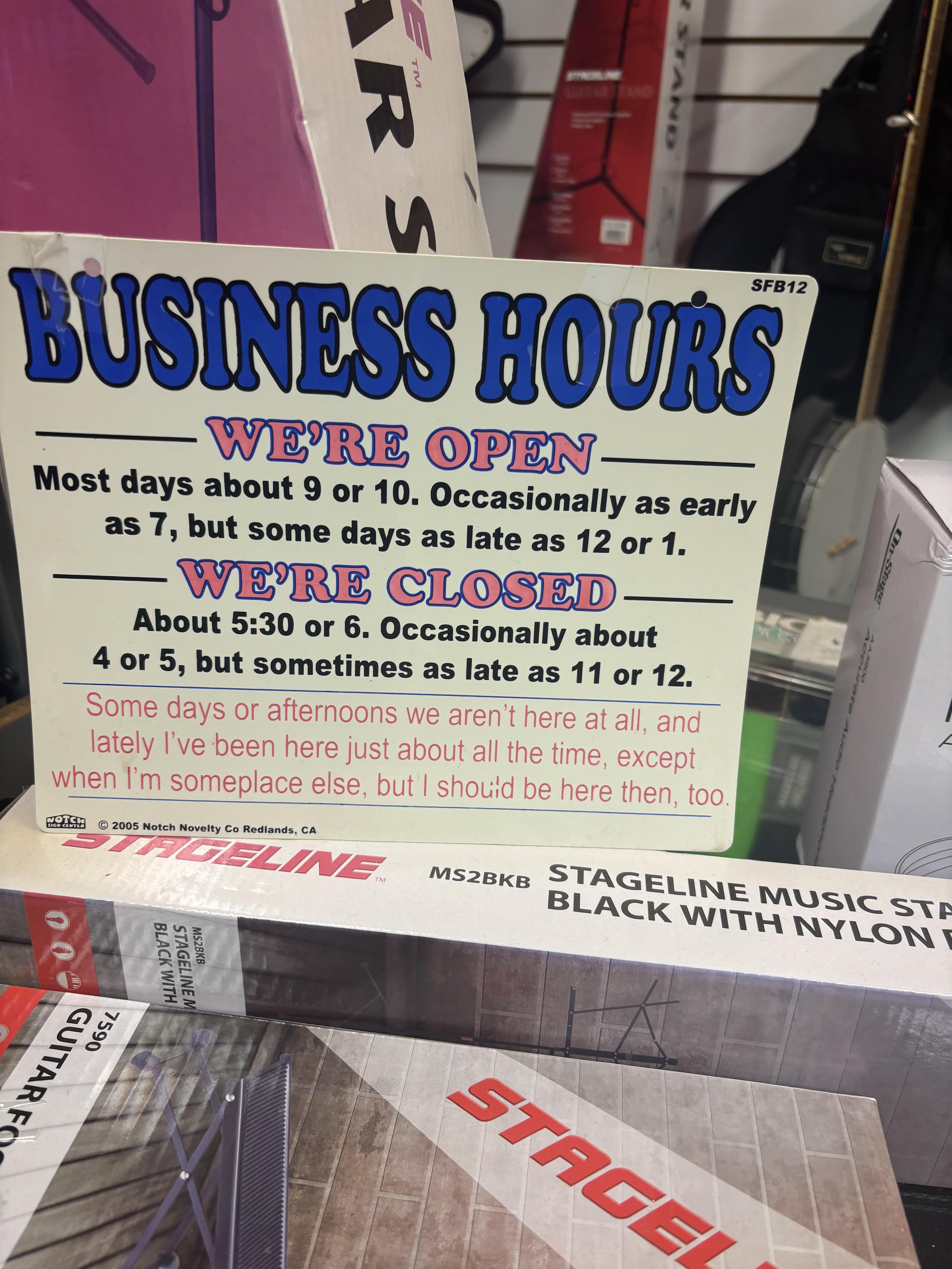 This is from Good Omens. It’s the hours for the AZ Fell and Co. bookstore Aziraphael (an angel who loves books and hates selling them)