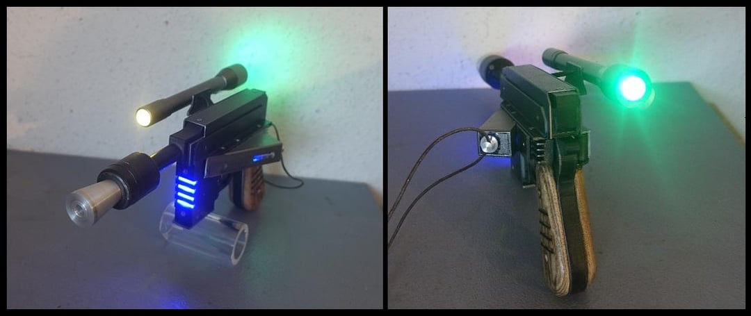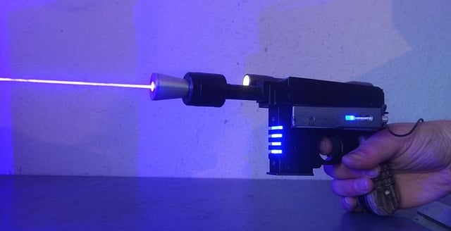 Was asked to make a “Han Solo Special” blaster, so I made the classic DL-44 but with a few twists. Guy asked for “more light” so I lit that scope, cam makes it look way brighter than it really is. Main feature is the kyber-shard pendant that acts as the main switch. Plug it in, and you turn it on!
