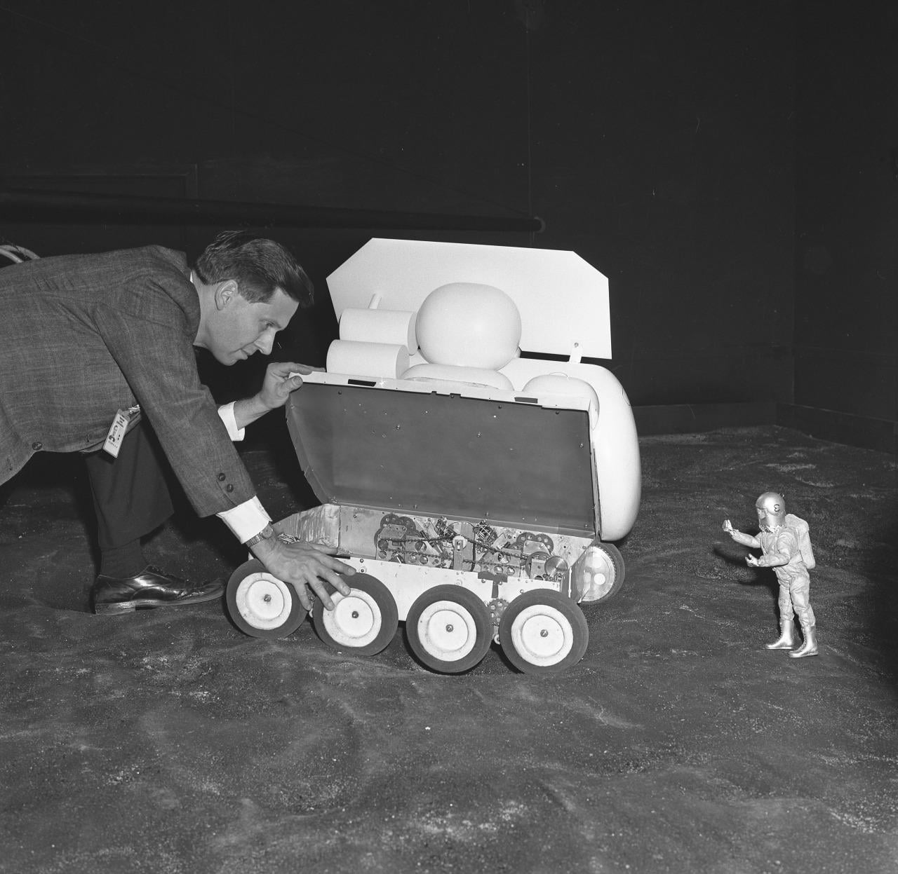 Northrop engineer William Sponsler unpacking his Lunar Surface Vehicle model, November 22, 1964