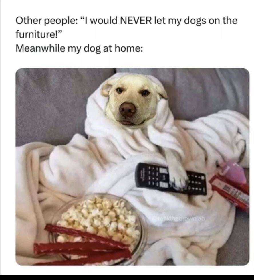 I dont understand the “no dogs on furniture” thing, all my life dogs have been allowed on our furniture and if they are properly trained and loved and cared for they dont cause issues for us. To me saying your dog isnt allowed on the furniture is basically saying you are too lazy or something like that. And I guess you could say the fur getting stuck to the furniture is the problem but then why did you get a dog? And its not gonna stop the fur getting stuck to the furniture its just gonna sort of slow it down. Also, so no “um acshuallly” people come in and try to say otherwise, by furniture im referring to couches and stuff not tables and kitchen chairs.