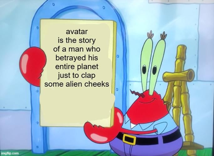 “Man who gave up the use of his legs in military service, was too poor to afford the basic treatment that all rich folk keep under lock and key that could have fixed his legs, lives on a planet he himself describes as being dead and that there is “no green there”. Then learns his only family member died during a Corpo-Imperialist Colonization attempt on an alien planet, agrees to take his brother’s place in order to afford spinal surgery, then reaches the alien planet after months in cryosleep, sees how beautiful and untouched by corporate exploitation it is, finds and meets a woman he genuinely falls deeply in love with, spends at least like a year learning everything about her culture and people, and then realizes he quite likes being able to walk, have someone who he loves and loves him in return, and NOT living on a dry dead gray husk of a world barely clinging to life after it was ruthlessly ground to death by the same people who refused him a basic surgery because he couldn’t afford it.”