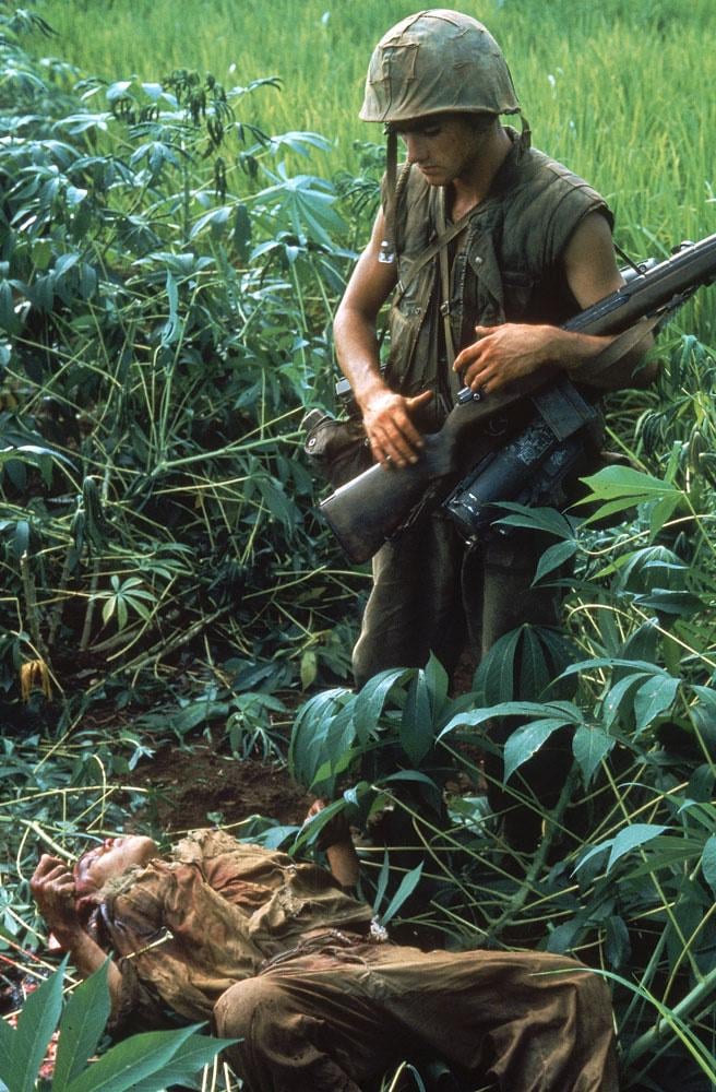 An American Marine looks at the body of a North Vietnamese killed during Operation Prairie near the DMZ during the Vietnam War, October 1966.[656×1000]
