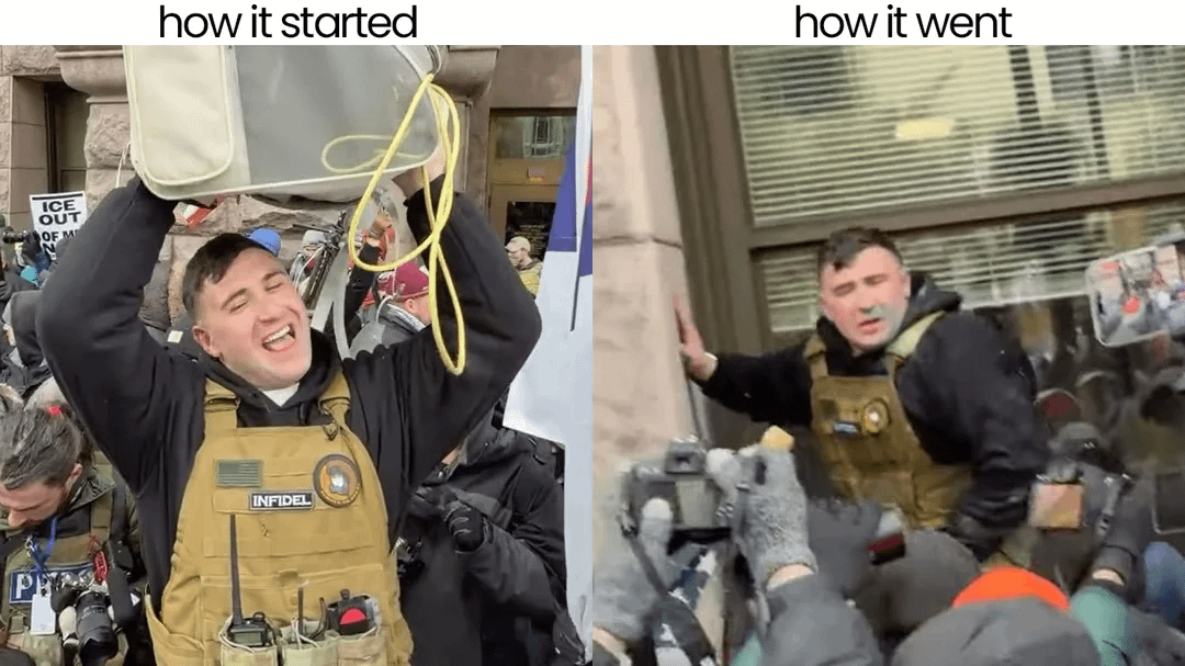 It’s -7F in Minneapolis, -20F with wind chill. This yahoo showed up with 10 friends in a sweater with no hat or gloves. Over 1000 counter protestors sprayed him with water pistols and water balloons.