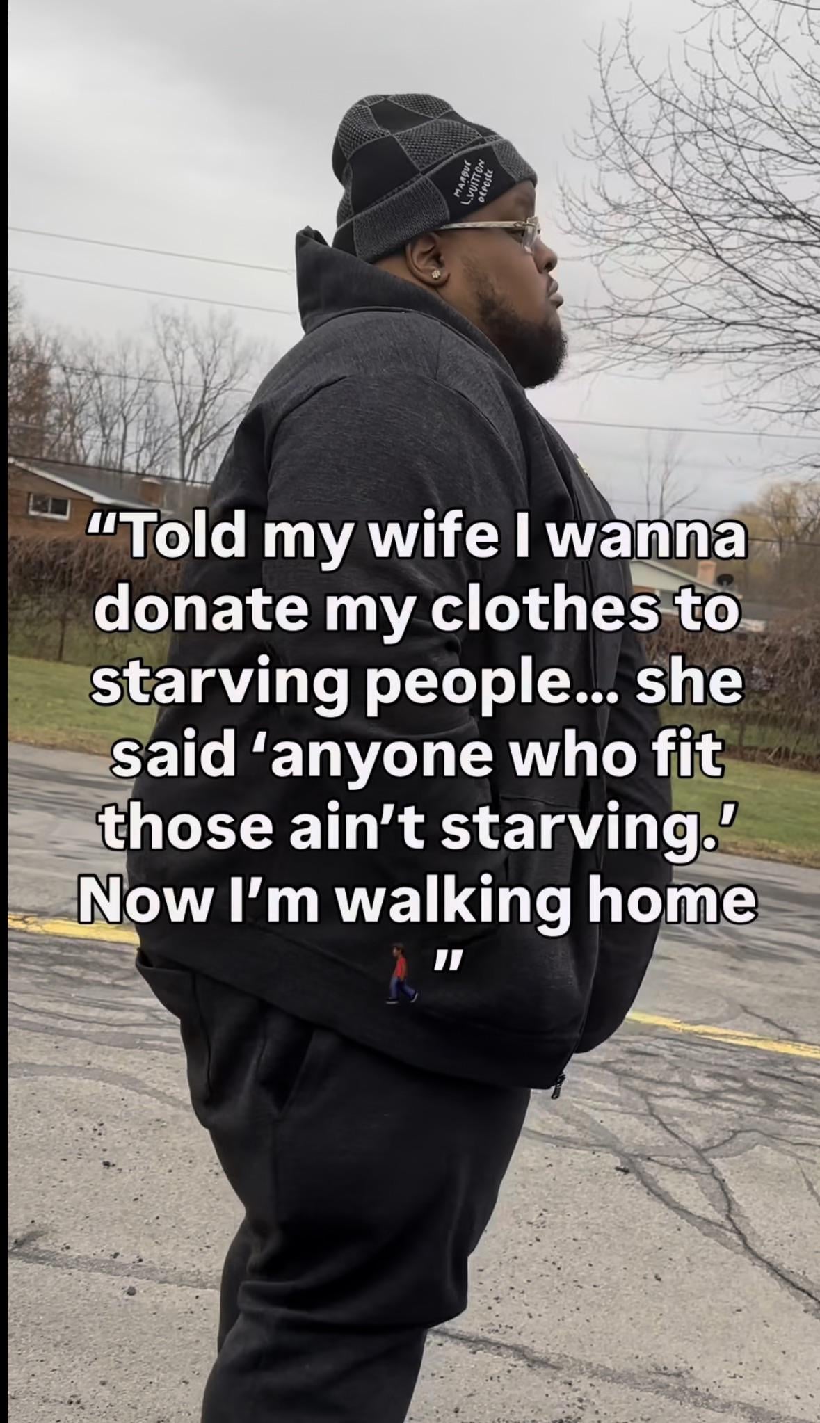 Funny punchline but the setup makes no sense lol. “Oh that person is hungry, I bet they need my clothes” bro, they need food.