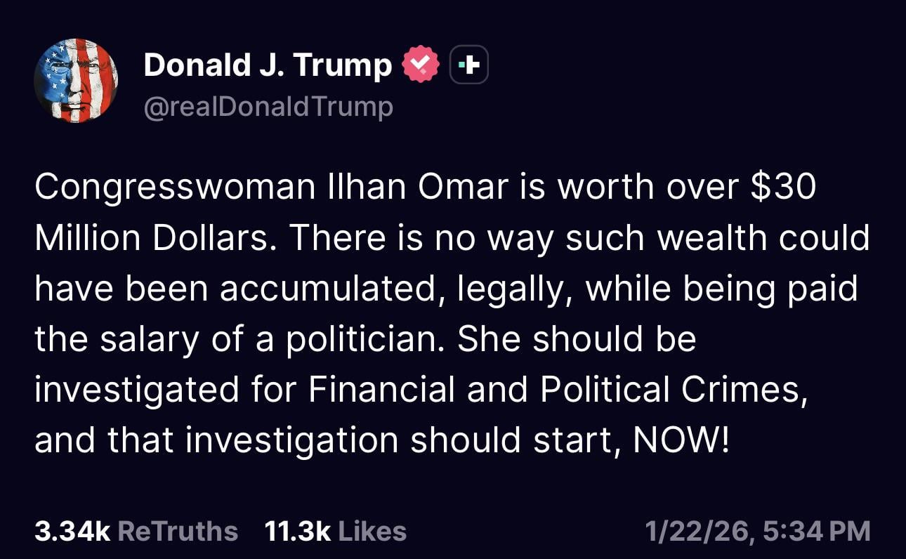 Ilhan Omar speaks up for human rights and the most vulnerable, she’s never tried to overthrow the American government or gave permission for ICE Gestapo agents to kidnap people off the streets and shoot unarmed mothers in the face and send children to concentration camps, so donald jackass trump can sit down and shut it.
