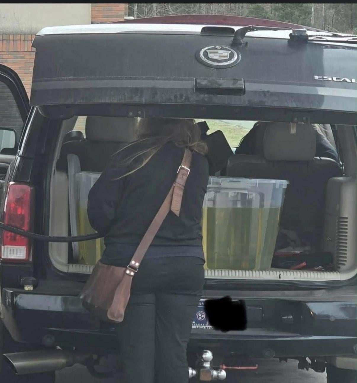 It took me way too long to realize they were dispensing gasoline into the tubs in the back of their car.