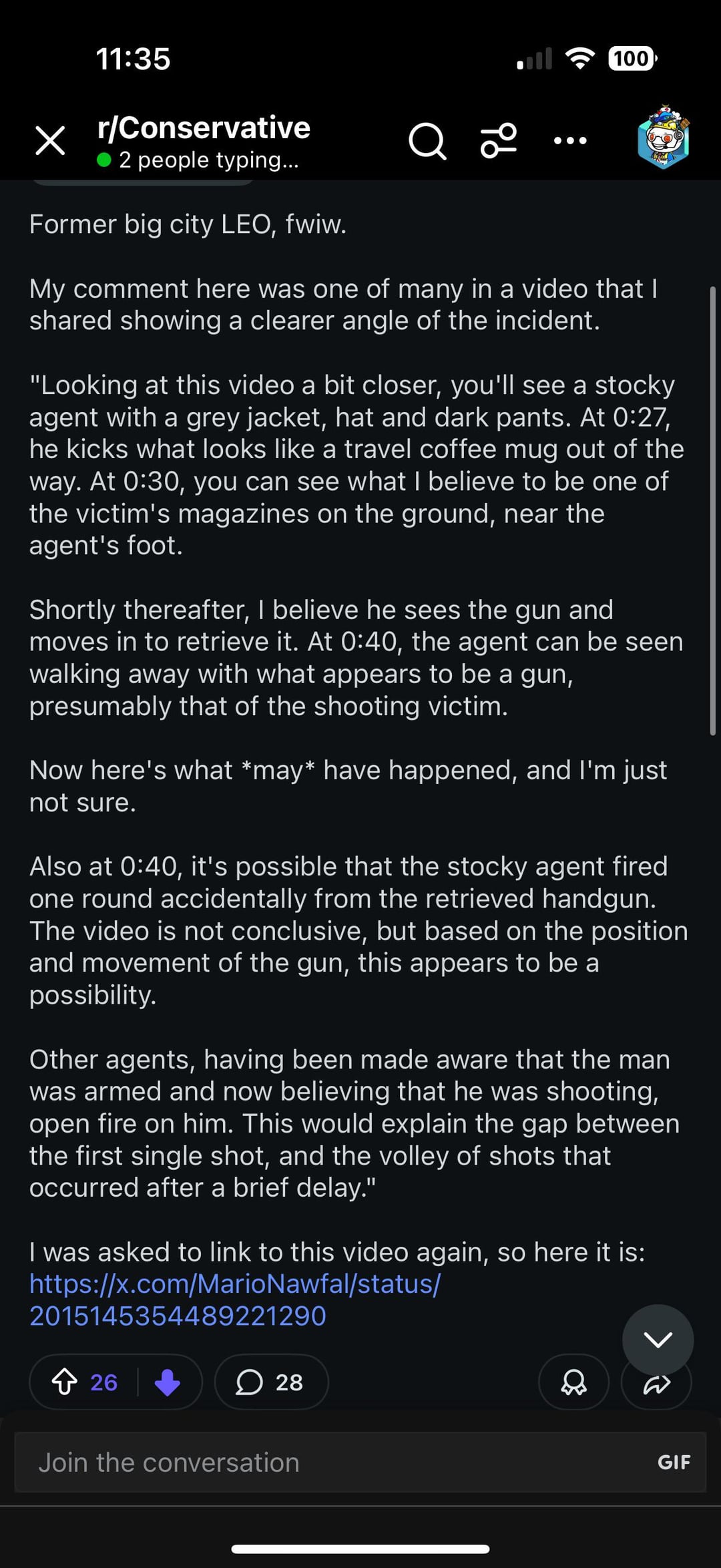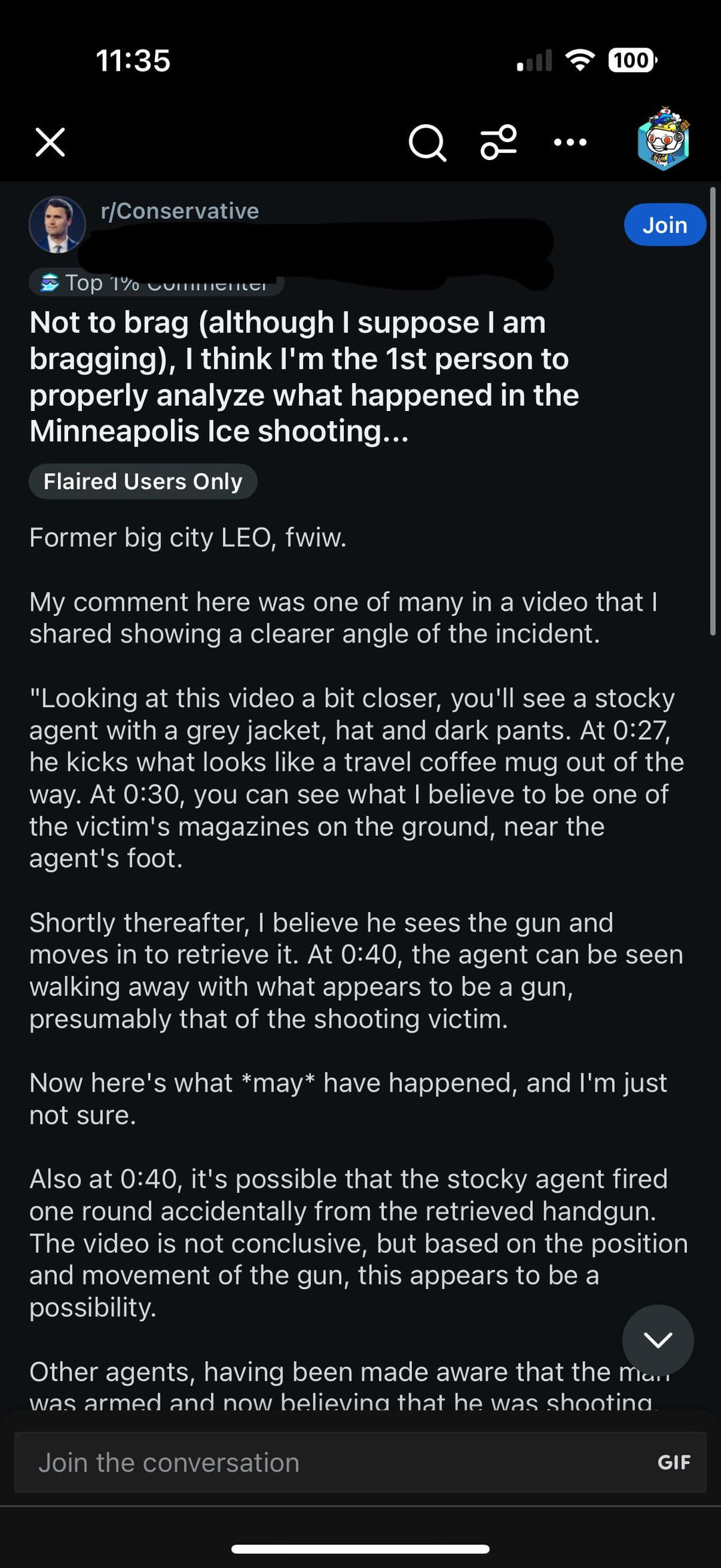 American politics stuff so my bad, but Dude posts the most Luke warm take, a sequence of events that have been talked about since early yesterday, even Charlie (moistcritikal) in his video brought up 90% of the things this guy “discovered”. And everyone in the comments is like “yea man you’re the first person I seen to really hit it in the nail”. Like complete echo chamber, not even an attempt interact with anything that isn’t being spoon feed to them. but still to them this is a “merky situation at best” and “they’re not questioning LEO’s actions. Like Jesus are we serious? I know this is going to get taken down cuz it’s a meta post and some people on a conservative sub don’t account for a population, but holy fuck dude did we not all see an American person get basically executed by the US gov yesterday? I think the nicest interpretation you can have is that these officers are dumb asf, untrained, and trigger happy, which like why would we support bringing that to the neighbors with our kids? Like genuinely even if both of the shootings this year in Minnesota were completely by the book, to save an officer, or something, they have showed complete disregard for gun safety since it’s a miracle that no other officer got hit in the first or especially the shooting of Alex Pretti. Yet and still “ICE needs to do its job” is a constant thought because they’re so blinded by the lie that illegals have taken their jobs and money, and that ice is only going after the criminals which just isn’t true, you can look it up google it if you don’t agree. Facts don’t care about your feelings, man. And your lack of awareness to the facts got an innocent man murdered, and we’re like a quarter into this second Trump presidency.