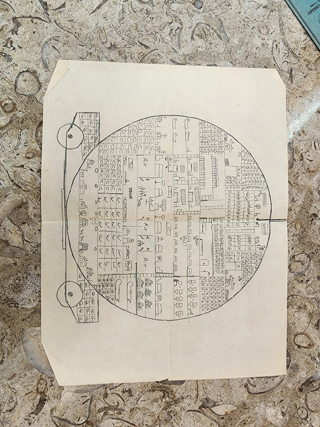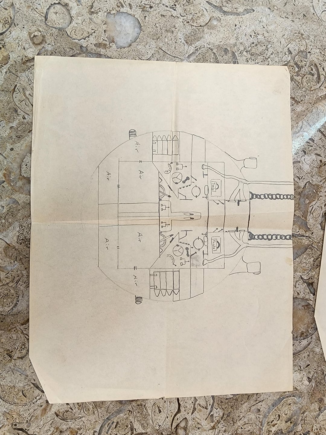 I used to draw similar cross sections as a kid and was floored when I found these two drawings inside a set of illustrated medical encyclopedias I bought as part of an antique book lot. The copyright date of the books was 1929, so these may have been drawn sometime after. I think it is some kind of massive tank and diving bell/submarine. I imagine some young sci-fi enthusiast imagining a future battlefield in the interwar years.