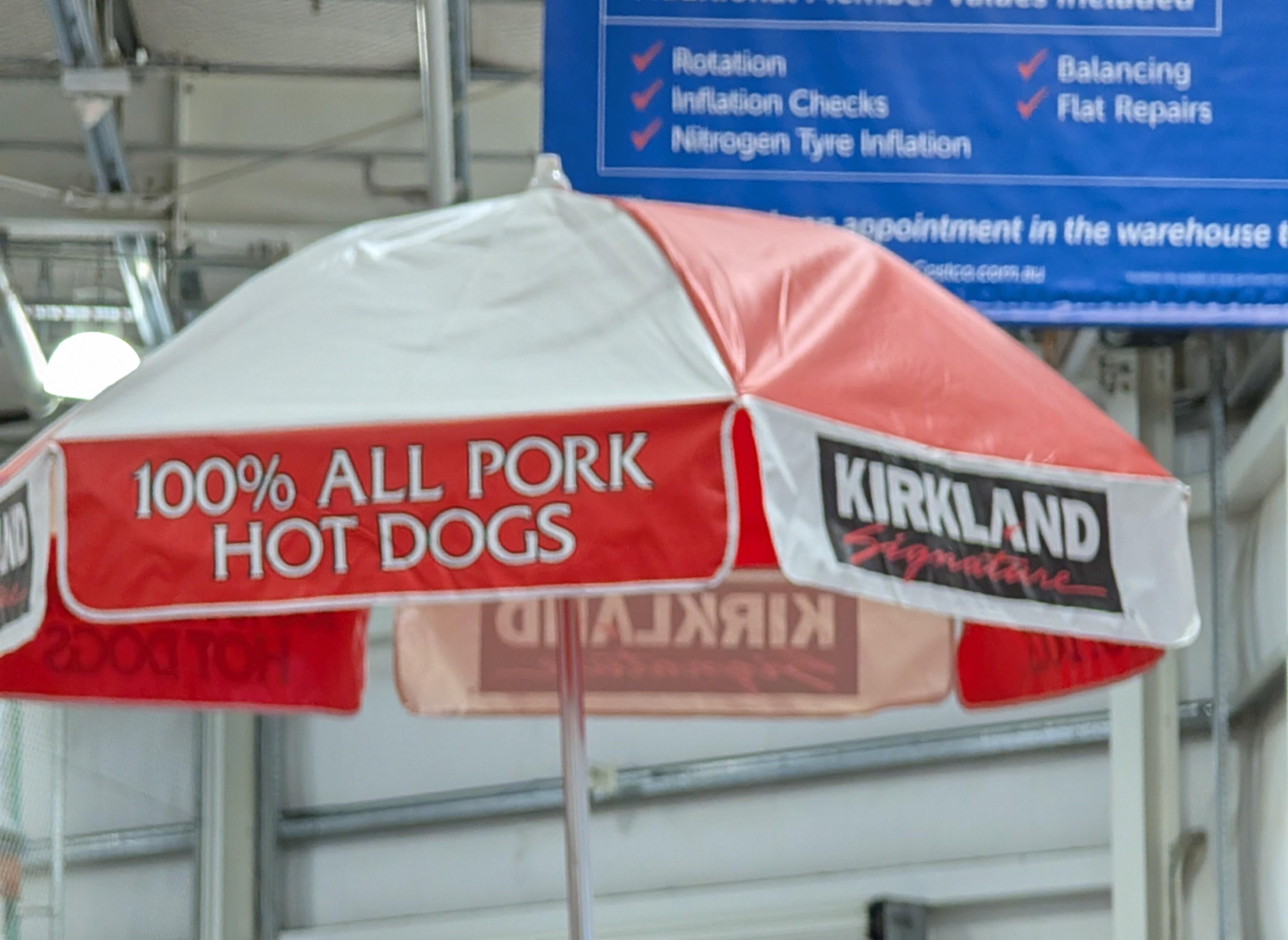 For those wondering why this is mildly interesting, Its a costco thing. In the US the 1/4 pound ALL BEEF hotdog and drink combo for $1.50 is practically a cultural meme in the US… and international costco aficionados love to post the differences they find costcos outside the US.